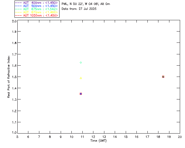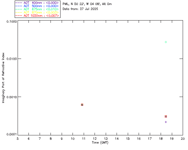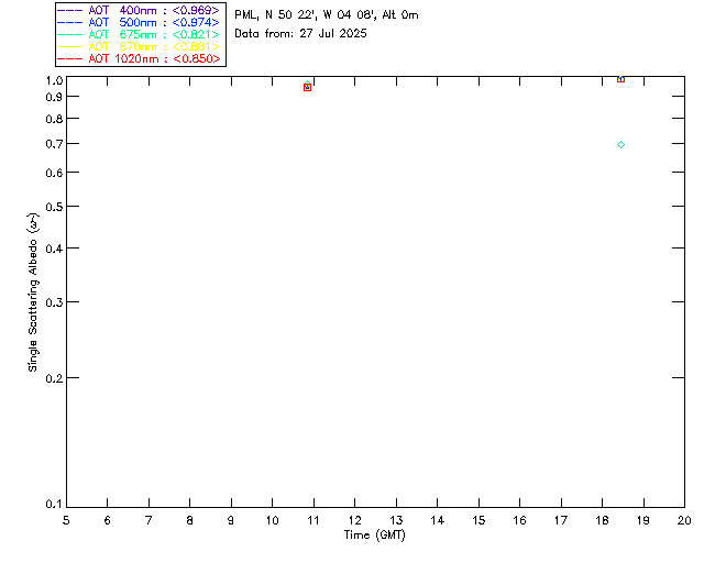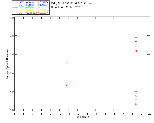 In May 2001 a PREDE POM01-L was installed on the roof of the Plymouth Marine Laboratory to continue the atmospheric correction research of the PML Remote Sensing Group. This was to replace the AERONET CIMEL sunphotometer situated at Rame Head which was decommissioned in 1999. The instrument operates at 7 wavelengths (315, 400, 500, 670, 870, 940 and 1020nm) and scans at pre-set angles away from the solar disk to determine, using the inversion code of Nakajima et al. (2006), various properties of tiny particles called aerosols within the atmospheric column. From these measurements useful atmospheric aerosol parameters such as the Aerosol Optical Thickness (AOT), aerosol size distribution and single scattering albedo can be calculated. Marine aerosols tend to be bigger (D > 1µm) than those generated over the land (0.01 < D < 1µm) and are of a different chemical composition; marine aerosols are salt particles whereas terrestrial aerosols are sulphate compounds.