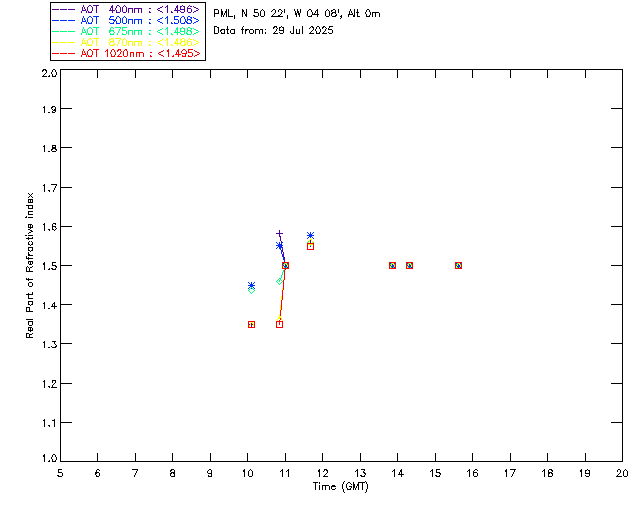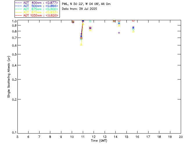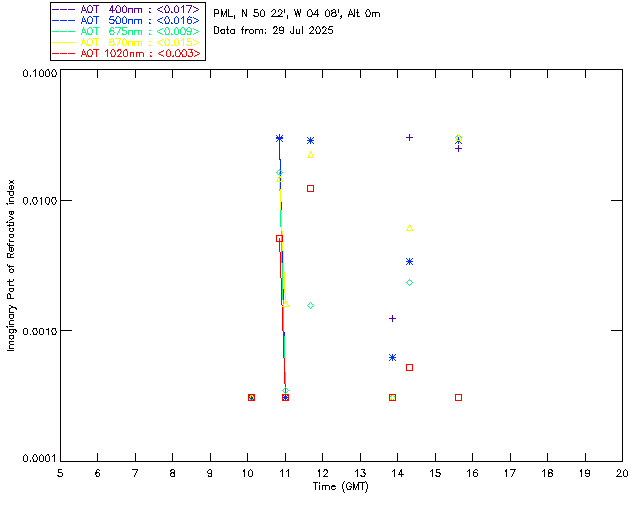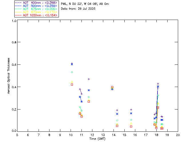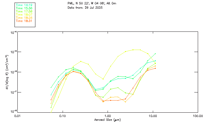 In May 2001 a PREDE POM01-L was installed on the roof of the Plymouth Marine Laboratory to continue the atmospheric correction research of the PML Remote Sensing Group. This was to replace the AERONET CIMEL sunphotometer situated at Rame Head which was decommissioned in 1999. The instrument operates at 7 wavelengths (315, 400, 500, 670, 870, 940 and 1020nm) and scans at pre-set angles away from the solar disk to determine, using the inversion code of Nakajima et al. (2006), various properties of tiny particles called aerosols within the atmospheric column. From these measurements useful atmospheric aerosol parameters such as the Aerosol Optical Thickness (AOT), aerosol size distribution and single scattering albedo can be calculated. Marine aerosols tend to be bigger (D > 1µm) than those generated over the land (0.01 < D < 1µm) and are of a different chemical composition; marine aerosols are salt particles whereas terrestrial aerosols are sulphate compounds.