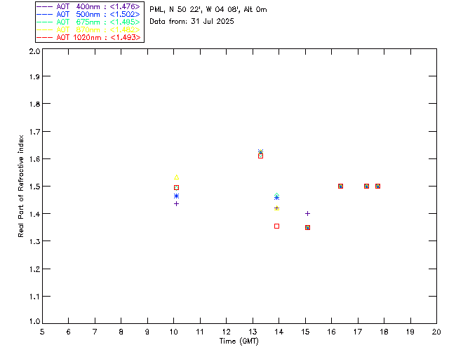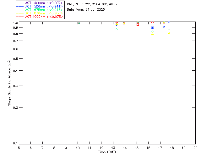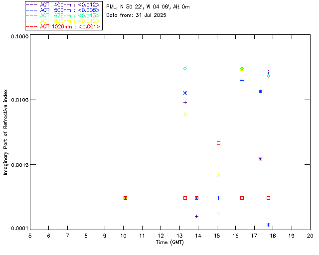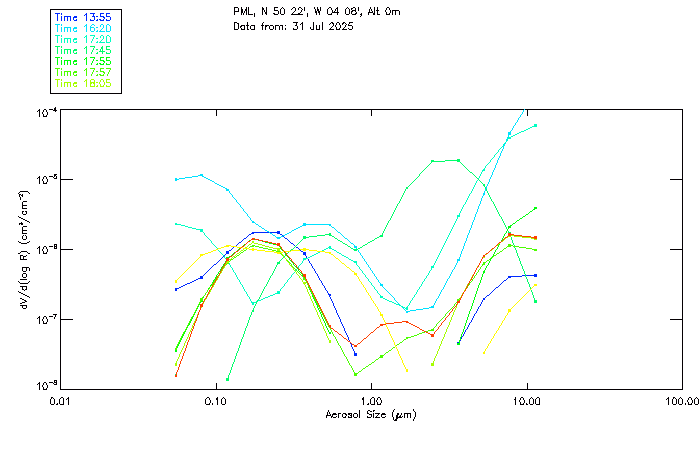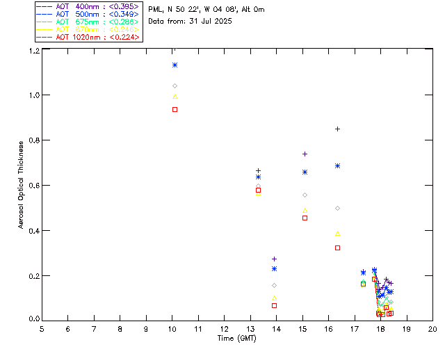 In May 2001 a PREDE POM01-L was installed on the roof of the Plymouth Marine Laboratory to continue the atmospheric correction research of the PML Remote Sensing Group. This was to replace the AERONET CIMEL sunphotometer situated at Rame Head which was decommissioned in 1999. The instrument operates at 7 wavelengths (315, 400, 500, 670, 870, 940 and 1020nm) and scans at pre-set angles away from the solar disk to determine, using the inversion code of Nakajima et al. (2006), various properties of tiny particles called aerosols within the atmospheric column. From these measurements useful atmospheric aerosol parameters such as the Aerosol Optical Thickness (AOT), aerosol size distribution and single scattering albedo can be calculated. Marine aerosols tend to be bigger (D > 1µm) than those generated over the land (0.01 < D < 1µm) and are of a different chemical composition; marine aerosols are salt particles whereas terrestrial aerosols are sulphate compounds.