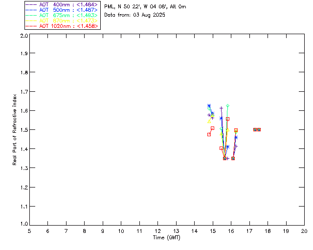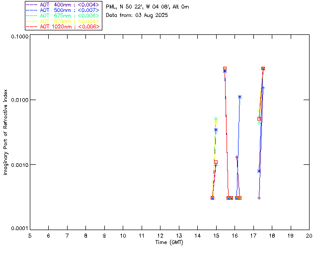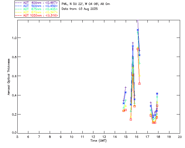 In May 2001 a PREDE POM01-L was installed on the roof of the Plymouth Marine Laboratory to continue the atmospheric correction research of the PML Remote Sensing Group. This was to replace the AERONET CIMEL sunphotometer situated at Rame Head which was decommissioned in 1999. The instrument operates at 7 wavelengths (315, 400, 500, 670, 870, 940 and 1020nm) and scans at pre-set angles away from the solar disk to determine, using the inversion code of Nakajima et al. (2006), various properties of tiny particles called aerosols within the atmospheric column. From these measurements useful atmospheric aerosol parameters such as the Aerosol Optical Thickness (AOT), aerosol size distribution and single scattering albedo can be calculated. Marine aerosols tend to be bigger (D > 1µm) than those generated over the land (0.01 < D < 1µm) and are of a different chemical composition; marine aerosols are salt particles whereas terrestrial aerosols are sulphate compounds.