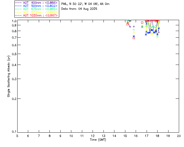 In May 2001 a PREDE POM01-L was installed on the roof of the Plymouth Marine Laboratory to continue the atmospheric correction research of the PML Remote Sensing Group. This was to replace the AERONET CIMEL sunphotometer situated at Rame Head which was decommissioned in 1999. The instrument operates at 7 wavelengths (315, 400, 500, 670, 870, 940 and 1020nm) and scans at pre-set angles away from the solar disk to determine, using the inversion code of Nakajima et al. (2006), various properties of tiny particles called aerosols within the atmospheric column. From these measurements useful atmospheric aerosol parameters such as the Aerosol Optical Thickness (AOT), aerosol size distribution and single scattering albedo can be calculated. Marine aerosols tend to be bigger (D > 1µm) than those generated over the land (0.01 < D < 1µm) and are of a different chemical composition; marine aerosols are salt particles whereas terrestrial aerosols are sulphate compounds.