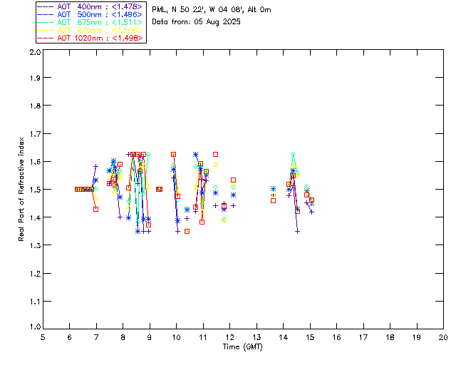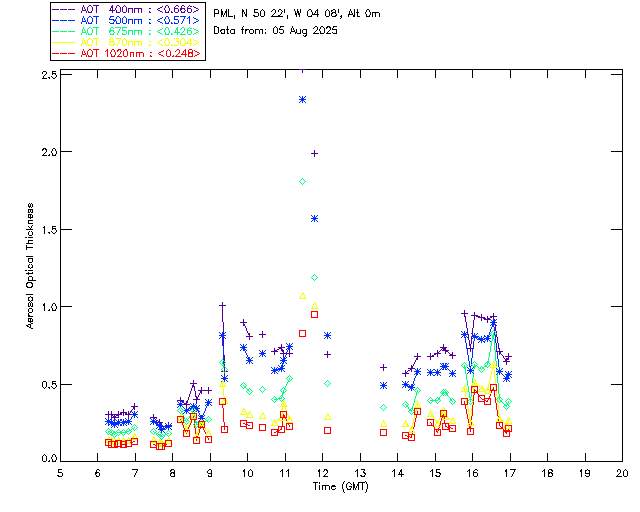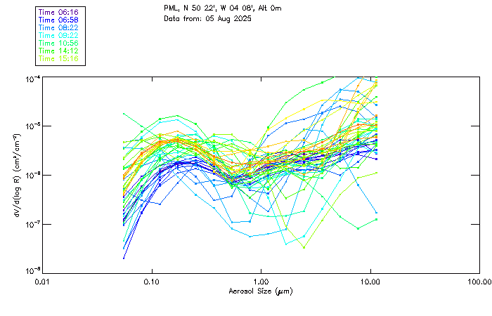 In May 2001 a PREDE POM01-L was installed on the roof of the Plymouth Marine Laboratory to continue the atmospheric correction research of the PML Remote Sensing Group. This was to replace the AERONET CIMEL sunphotometer situated at Rame Head which was decommissioned in 1999. The instrument operates at 7 wavelengths (315, 400, 500, 670, 870, 940 and 1020nm) and scans at pre-set angles away from the solar disk to determine, using the inversion code of Nakajima et al. (2006), various properties of tiny particles called aerosols within the atmospheric column. From these measurements useful atmospheric aerosol parameters such as the Aerosol Optical Thickness (AOT), aerosol size distribution and single scattering albedo can be calculated. Marine aerosols tend to be bigger (D > 1µm) than those generated over the land (0.01 < D < 1µm) and are of a different chemical composition; marine aerosols are salt particles whereas terrestrial aerosols are sulphate compounds.