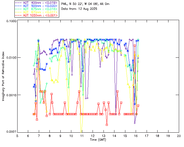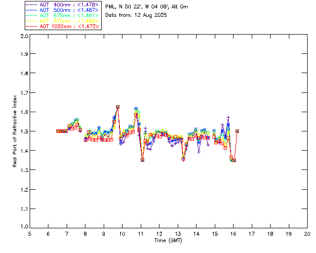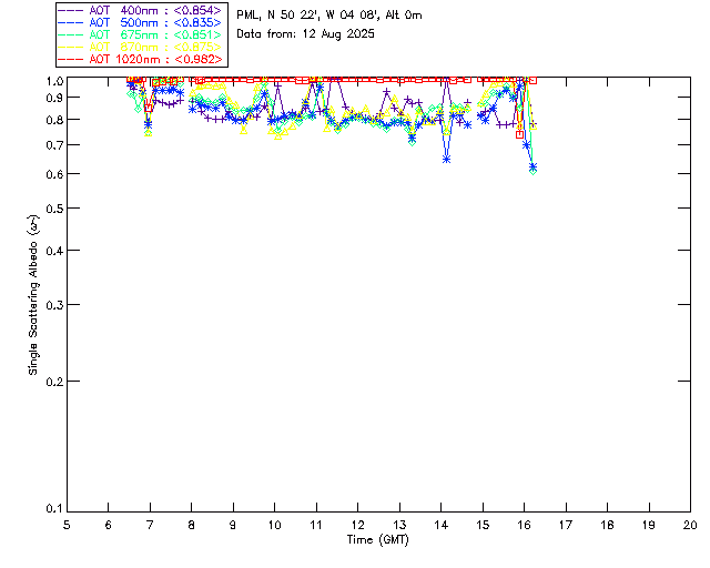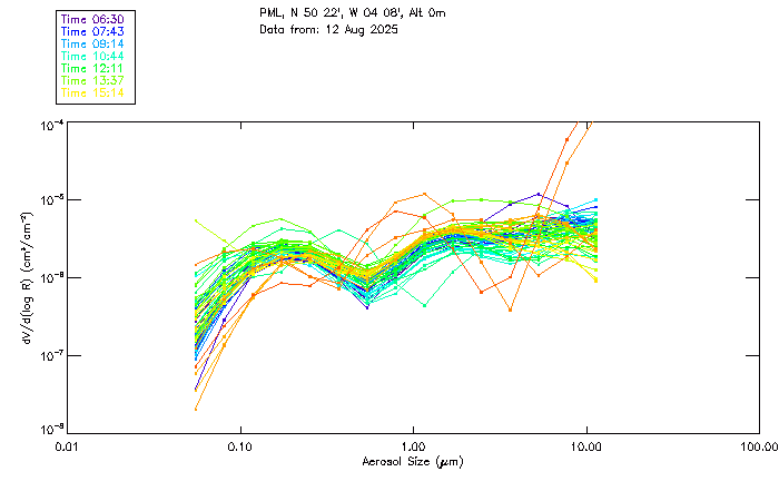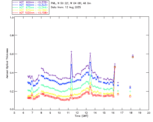In May 2001 a PREDE POM01-L was installed on the roof of the Plymouth Marine Laboratory to continue the atmospheric correction research of the PML Remote Sensing Group. This was to replace the AERONET CIMEL sunphotometer situated at Rame Head which was decommissioned in 1999. The instrument operates at 7 wavelengths (315, 400, 500, 670, 870, 940 and 1020nm) and scans at pre-set angles away from the solar disk to determine, using the inversion code of Nakajima et al. (2006), various properties of tiny particles called aerosols within the atmospheric column. From these measurements useful atmospheric aerosol parameters such as the Aerosol Optical Thickness (AOT), aerosol size distribution and single scattering albedo can be calculated. Marine aerosols tend to be bigger (D > 1µm) than those generated over the land (0.01 < D < 1µm) and are of a different chemical composition; marine aerosols are salt particles whereas terrestrial aerosols are sulphate compounds.
