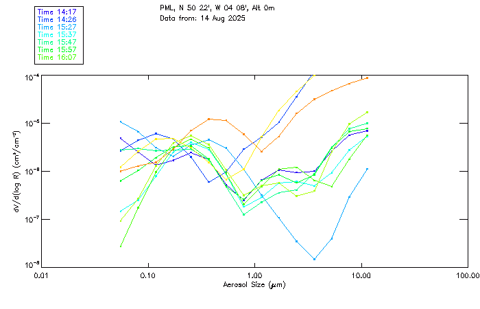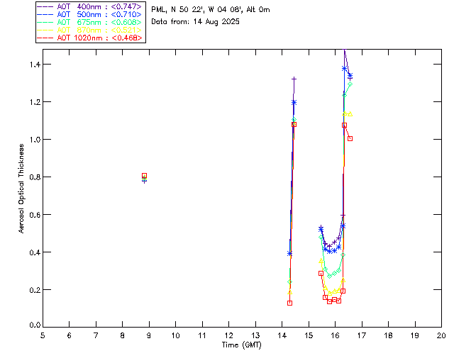 In May 2001 a PREDE POM01-L was installed on the roof of the Plymouth Marine Laboratory to continue the atmospheric correction research of the PML Remote Sensing Group. This was to replace the AERONET CIMEL sunphotometer situated at Rame Head which was decommissioned in 1999. The instrument operates at 7 wavelengths (315, 400, 500, 670, 870, 940 and 1020nm) and scans at pre-set angles away from the solar disk to determine, using the inversion code of Nakajima et al. (2006), various properties of tiny particles called aerosols within the atmospheric column. From these measurements useful atmospheric aerosol parameters such as the Aerosol Optical Thickness (AOT), aerosol size distribution and single scattering albedo can be calculated. Marine aerosols tend to be bigger (D > 1µm) than those generated over the land (0.01 < D < 1µm) and are of a different chemical composition; marine aerosols are salt particles whereas terrestrial aerosols are sulphate compounds.