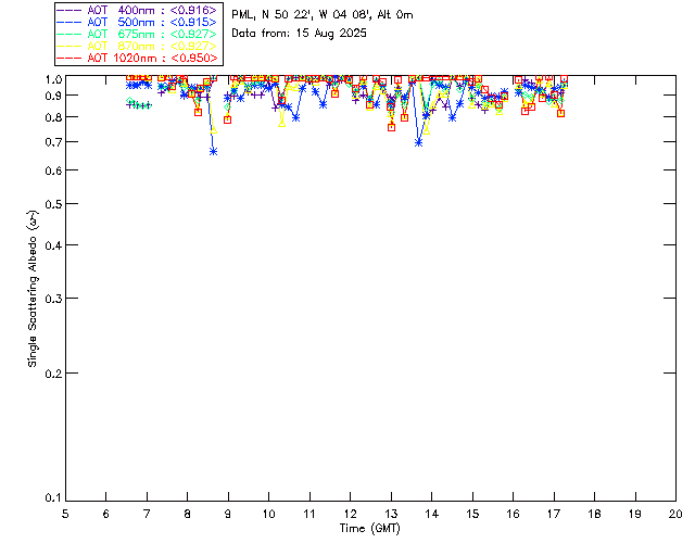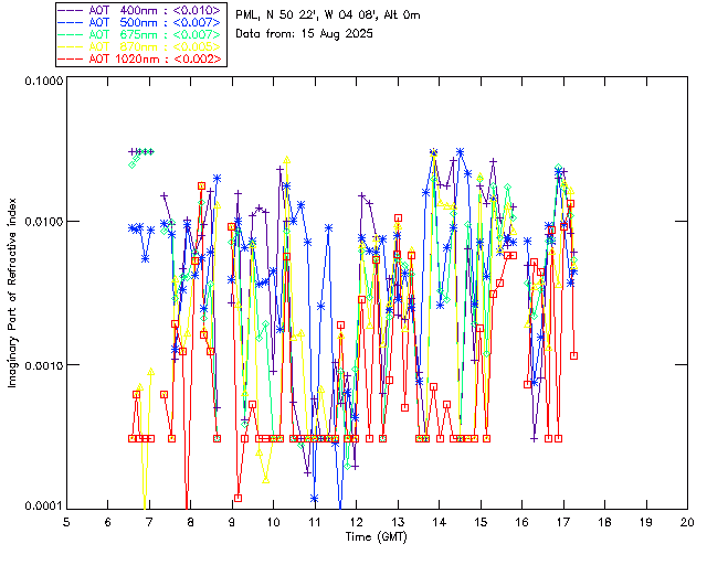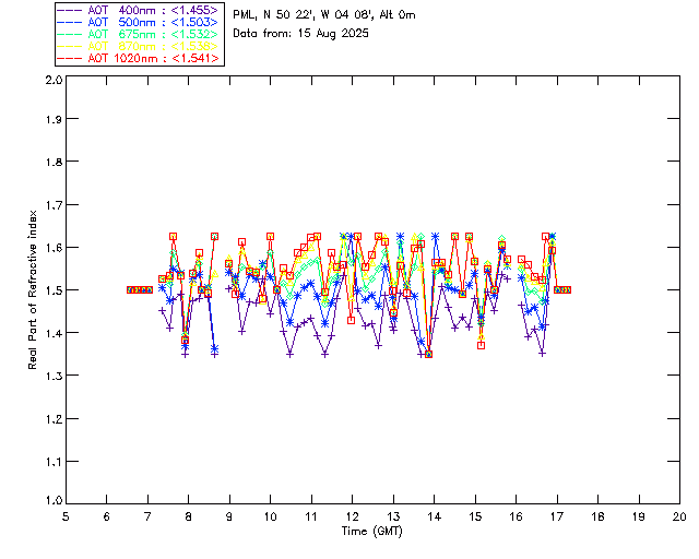 In May 2001 a PREDE POM01-L was installed on the roof of the Plymouth Marine Laboratory to continue the atmospheric correction research of the PML Remote Sensing Group. This was to replace the AERONET CIMEL sunphotometer situated at Rame Head which was decommissioned in 1999. The instrument operates at 7 wavelengths (315, 400, 500, 670, 870, 940 and 1020nm) and scans at pre-set angles away from the solar disk to determine, using the inversion code of Nakajima et al. (2006), various properties of tiny particles called aerosols within the atmospheric column. From these measurements useful atmospheric aerosol parameters such as the Aerosol Optical Thickness (AOT), aerosol size distribution and single scattering albedo can be calculated. Marine aerosols tend to be bigger (D > 1µm) than those generated over the land (0.01 < D < 1µm) and are of a different chemical composition; marine aerosols are salt particles whereas terrestrial aerosols are sulphate compounds.