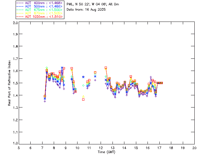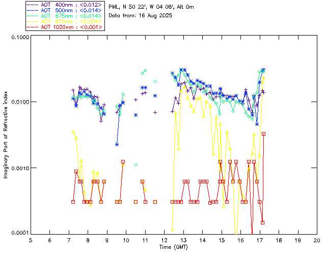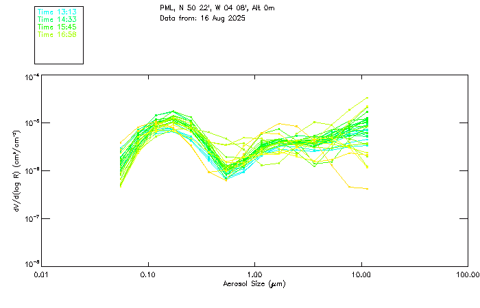 In May 2001 a PREDE POM01-L was installed on the roof of the Plymouth Marine Laboratory to continue the atmospheric correction research of the PML Remote Sensing Group. This was to replace the AERONET CIMEL sunphotometer situated at Rame Head which was decommissioned in 1999. The instrument operates at 7 wavelengths (315, 400, 500, 670, 870, 940 and 1020nm) and scans at pre-set angles away from the solar disk to determine, using the inversion code of Nakajima et al. (2006), various properties of tiny particles called aerosols within the atmospheric column. From these measurements useful atmospheric aerosol parameters such as the Aerosol Optical Thickness (AOT), aerosol size distribution and single scattering albedo can be calculated. Marine aerosols tend to be bigger (D > 1µm) than those generated over the land (0.01 < D < 1µm) and are of a different chemical composition; marine aerosols are salt particles whereas terrestrial aerosols are sulphate compounds.