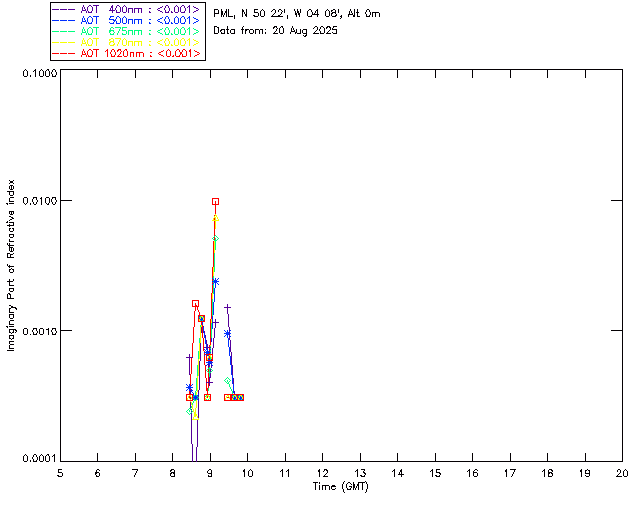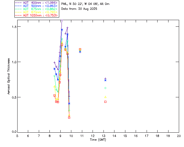In May 2001 a PREDE POM01-L was installed on the roof of the Plymouth Marine Laboratory to continue the atmospheric correction research of the PML Remote Sensing Group. This was to replace the AERONET CIMEL sunphotometer situated at Rame Head which was decommissioned in 1999. The instrument operates at 7 wavelengths (315, 400, 500, 670, 870, 940 and 1020nm) and scans at pre-set angles away from the solar disk to determine, using the inversion code of Nakajima et al. (2006), various properties of tiny particles called aerosols within the atmospheric column. From these measurements useful atmospheric aerosol parameters such as the Aerosol Optical Thickness (AOT), aerosol size distribution and single scattering albedo can be calculated. Marine aerosols tend to be bigger (D > 1µm) than those generated over the land (0.01 < D < 1µm) and are of a different chemical composition; marine aerosols are salt particles whereas terrestrial aerosols are sulphate compounds.