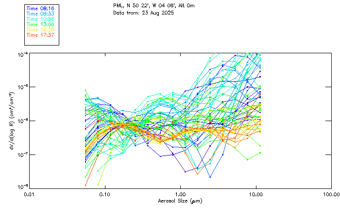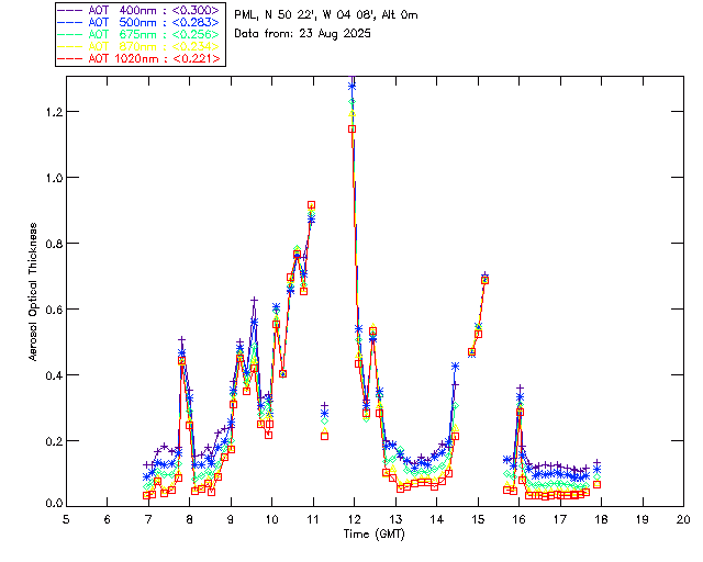 In May 2001 a PREDE POM01-L was installed on the roof of the Plymouth Marine Laboratory to continue the atmospheric correction research of the PML Remote Sensing Group. This was to replace the AERONET CIMEL sunphotometer situated at Rame Head which was decommissioned in 1999. The instrument operates at 7 wavelengths (315, 400, 500, 670, 870, 940 and 1020nm) and scans at pre-set angles away from the solar disk to determine, using the inversion code of Nakajima et al. (2006), various properties of tiny particles called aerosols within the atmospheric column. From these measurements useful atmospheric aerosol parameters such as the Aerosol Optical Thickness (AOT), aerosol size distribution and single scattering albedo can be calculated. Marine aerosols tend to be bigger (D > 1µm) than those generated over the land (0.01 < D < 1µm) and are of a different chemical composition; marine aerosols are salt particles whereas terrestrial aerosols are sulphate compounds.