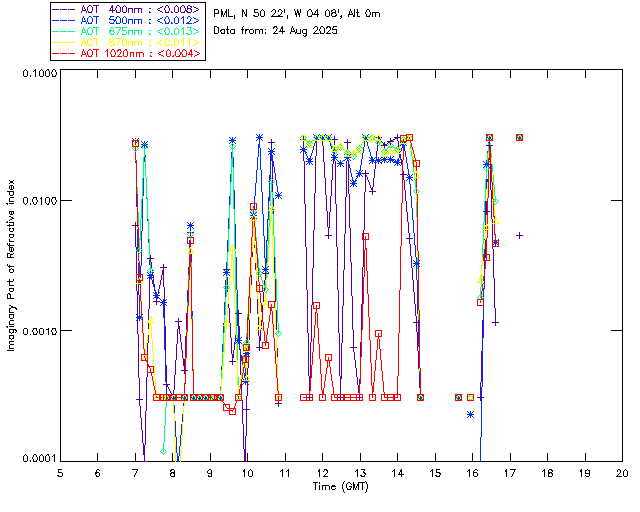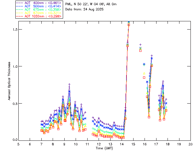 In May 2001 a PREDE POM01-L was installed on the roof of the Plymouth Marine Laboratory to continue the atmospheric correction research of the PML Remote Sensing Group. This was to replace the AERONET CIMEL sunphotometer situated at Rame Head which was decommissioned in 1999. The instrument operates at 7 wavelengths (315, 400, 500, 670, 870, 940 and 1020nm) and scans at pre-set angles away from the solar disk to determine, using the inversion code of Nakajima et al. (2006), various properties of tiny particles called aerosols within the atmospheric column. From these measurements useful atmospheric aerosol parameters such as the Aerosol Optical Thickness (AOT), aerosol size distribution and single scattering albedo can be calculated. Marine aerosols tend to be bigger (D > 1µm) than those generated over the land (0.01 < D < 1µm) and are of a different chemical composition; marine aerosols are salt particles whereas terrestrial aerosols are sulphate compounds.