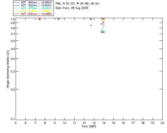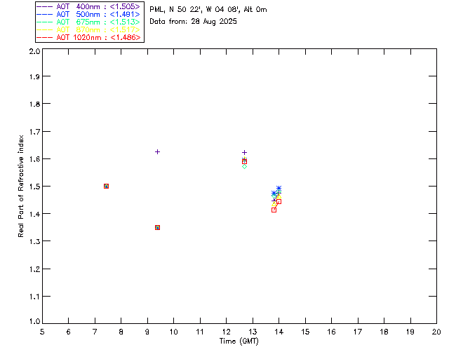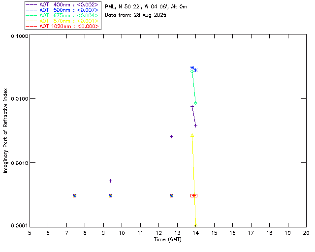 In May 2001 a PREDE POM01-L was installed on the roof of the Plymouth Marine Laboratory to continue the atmospheric correction research of the PML Remote Sensing Group. This was to replace the AERONET CIMEL sunphotometer situated at Rame Head which was decommissioned in 1999. The instrument operates at 7 wavelengths (315, 400, 500, 670, 870, 940 and 1020nm) and scans at pre-set angles away from the solar disk to determine, using the inversion code of Nakajima et al. (2006), various properties of tiny particles called aerosols within the atmospheric column. From these measurements useful atmospheric aerosol parameters such as the Aerosol Optical Thickness (AOT), aerosol size distribution and single scattering albedo can be calculated. Marine aerosols tend to be bigger (D > 1µm) than those generated over the land (0.01 < D < 1µm) and are of a different chemical composition; marine aerosols are salt particles whereas terrestrial aerosols are sulphate compounds.