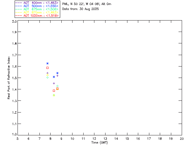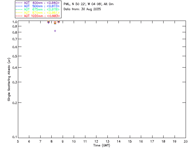 In May 2001 a PREDE POM01-L was installed on the roof of the Plymouth Marine Laboratory to continue the atmospheric correction research of the PML Remote Sensing Group. This was to replace the AERONET CIMEL sunphotometer situated at Rame Head which was decommissioned in 1999. The instrument operates at 7 wavelengths (315, 400, 500, 670, 870, 940 and 1020nm) and scans at pre-set angles away from the solar disk to determine, using the inversion code of Nakajima et al. (2006), various properties of tiny particles called aerosols within the atmospheric column. From these measurements useful atmospheric aerosol parameters such as the Aerosol Optical Thickness (AOT), aerosol size distribution and single scattering albedo can be calculated. Marine aerosols tend to be bigger (D > 1µm) than those generated over the land (0.01 < D < 1µm) and are of a different chemical composition; marine aerosols are salt particles whereas terrestrial aerosols are sulphate compounds.