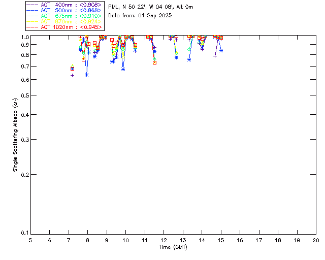 In May 2001 a PREDE POM01-L was installed on the roof of the Plymouth Marine Laboratory to continue the atmospheric correction research of the PML Remote Sensing Group. This was to replace the AERONET CIMEL sunphotometer situated at Rame Head which was decommissioned in 1999. The instrument operates at 7 wavelengths (315, 400, 500, 670, 870, 940 and 1020nm) and scans at pre-set angles away from the solar disk to determine, using the inversion code of Nakajima et al. (2006), various properties of tiny particles called aerosols within the atmospheric column. From these measurements useful atmospheric aerosol parameters such as the Aerosol Optical Thickness (AOT), aerosol size distribution and single scattering albedo can be calculated. Marine aerosols tend to be bigger (D > 1µm) than those generated over the land (0.01 < D < 1µm) and are of a different chemical composition; marine aerosols are salt particles whereas terrestrial aerosols are sulphate compounds.
