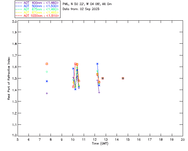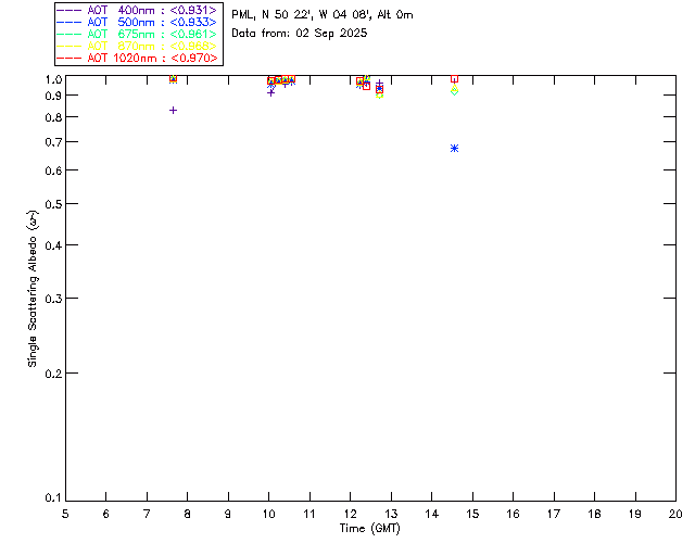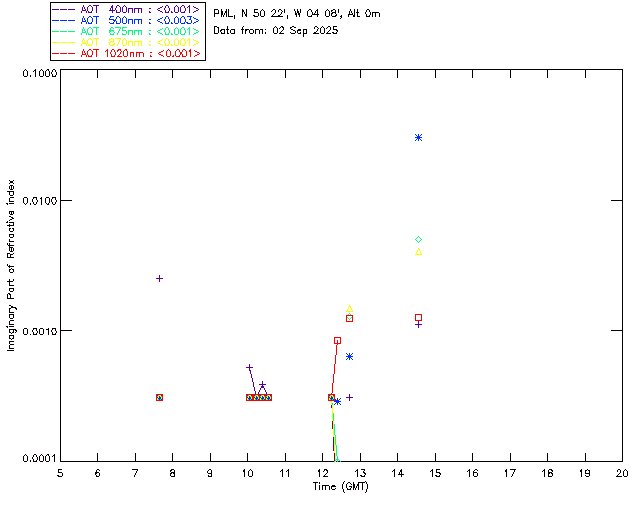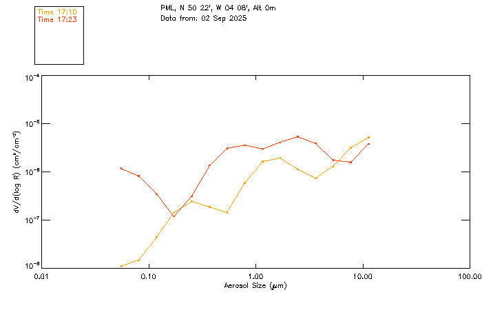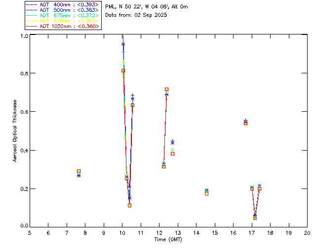 In May 2001 a PREDE POM01-L was installed on the roof of the Plymouth Marine Laboratory to continue the atmospheric correction research of the PML Remote Sensing Group. This was to replace the AERONET CIMEL sunphotometer situated at Rame Head which was decommissioned in 1999. The instrument operates at 7 wavelengths (315, 400, 500, 670, 870, 940 and 1020nm) and scans at pre-set angles away from the solar disk to determine, using the inversion code of Nakajima et al. (2006), various properties of tiny particles called aerosols within the atmospheric column. From these measurements useful atmospheric aerosol parameters such as the Aerosol Optical Thickness (AOT), aerosol size distribution and single scattering albedo can be calculated. Marine aerosols tend to be bigger (D > 1µm) than those generated over the land (0.01 < D < 1µm) and are of a different chemical composition; marine aerosols are salt particles whereas terrestrial aerosols are sulphate compounds.