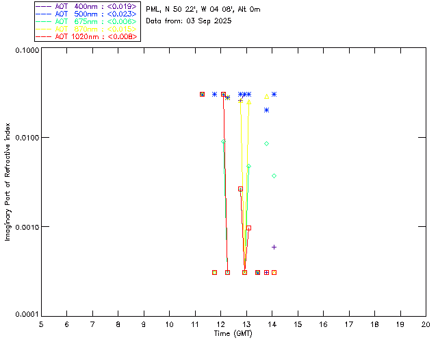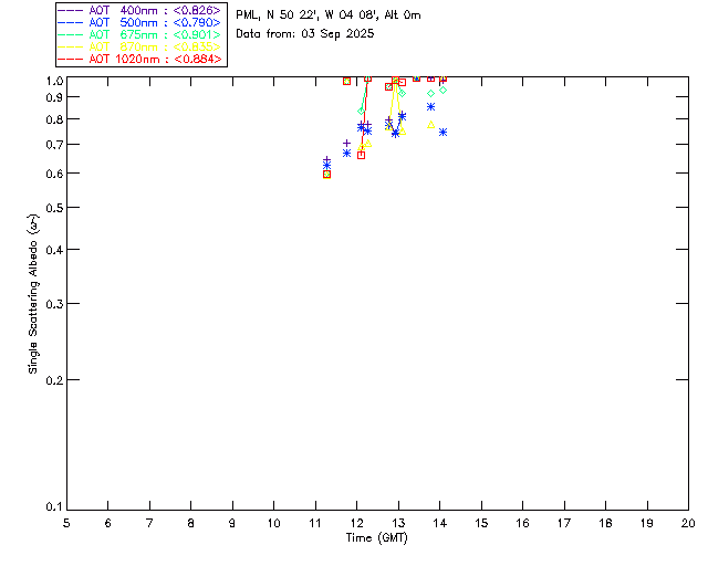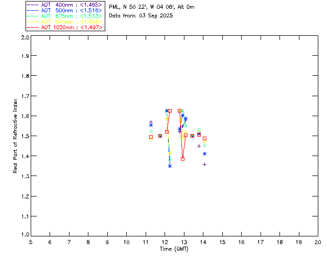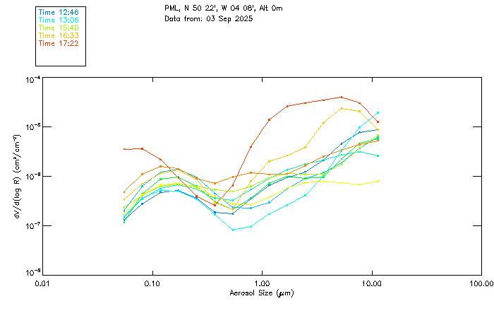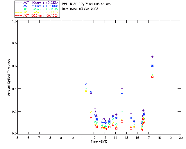 In May 2001 a PREDE POM01-L was installed on the roof of the Plymouth Marine Laboratory to continue the atmospheric correction research of the PML Remote Sensing Group. This was to replace the AERONET CIMEL sunphotometer situated at Rame Head which was decommissioned in 1999. The instrument operates at 7 wavelengths (315, 400, 500, 670, 870, 940 and 1020nm) and scans at pre-set angles away from the solar disk to determine, using the inversion code of Nakajima et al. (2006), various properties of tiny particles called aerosols within the atmospheric column. From these measurements useful atmospheric aerosol parameters such as the Aerosol Optical Thickness (AOT), aerosol size distribution and single scattering albedo can be calculated. Marine aerosols tend to be bigger (D > 1µm) than those generated over the land (0.01 < D < 1µm) and are of a different chemical composition; marine aerosols are salt particles whereas terrestrial aerosols are sulphate compounds.