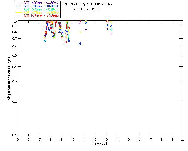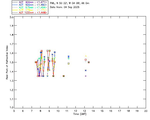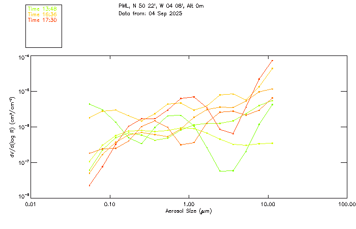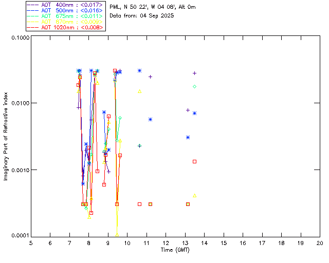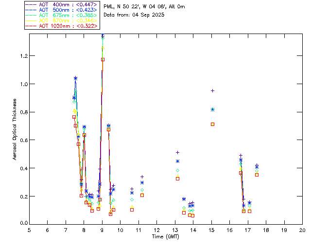 In May 2001 a PREDE POM01-L was installed on the roof of the Plymouth Marine Laboratory to continue the atmospheric correction research of the PML Remote Sensing Group. This was to replace the AERONET CIMEL sunphotometer situated at Rame Head which was decommissioned in 1999. The instrument operates at 7 wavelengths (315, 400, 500, 670, 870, 940 and 1020nm) and scans at pre-set angles away from the solar disk to determine, using the inversion code of Nakajima et al. (2006), various properties of tiny particles called aerosols within the atmospheric column. From these measurements useful atmospheric aerosol parameters such as the Aerosol Optical Thickness (AOT), aerosol size distribution and single scattering albedo can be calculated. Marine aerosols tend to be bigger (D > 1µm) than those generated over the land (0.01 < D < 1µm) and are of a different chemical composition; marine aerosols are salt particles whereas terrestrial aerosols are sulphate compounds.