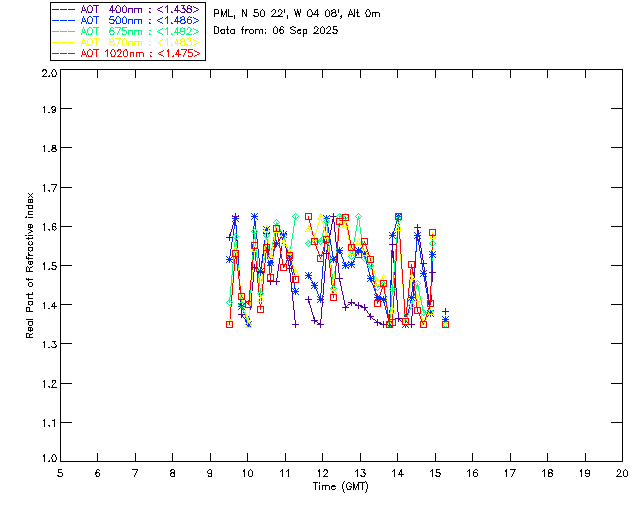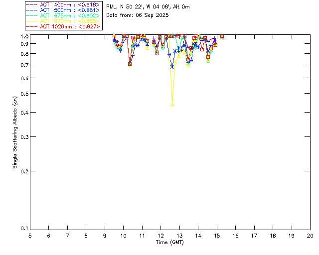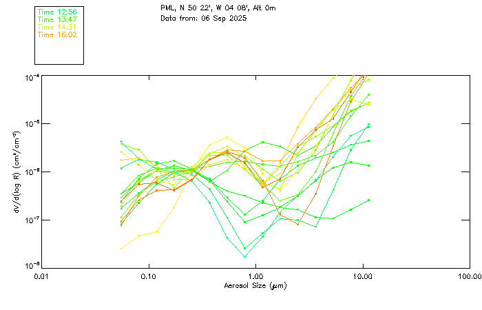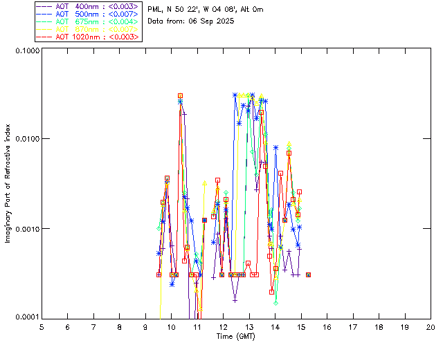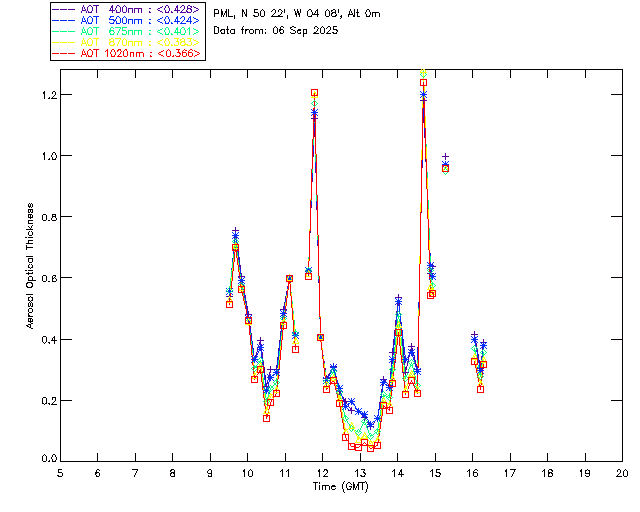 In May 2001 a PREDE POM01-L was installed on the roof of the Plymouth Marine Laboratory to continue the atmospheric correction research of the PML Remote Sensing Group. This was to replace the AERONET CIMEL sunphotometer situated at Rame Head which was decommissioned in 1999. The instrument operates at 7 wavelengths (315, 400, 500, 670, 870, 940 and 1020nm) and scans at pre-set angles away from the solar disk to determine, using the inversion code of Nakajima et al. (2006), various properties of tiny particles called aerosols within the atmospheric column. From these measurements useful atmospheric aerosol parameters such as the Aerosol Optical Thickness (AOT), aerosol size distribution and single scattering albedo can be calculated. Marine aerosols tend to be bigger (D > 1µm) than those generated over the land (0.01 < D < 1µm) and are of a different chemical composition; marine aerosols are salt particles whereas terrestrial aerosols are sulphate compounds.