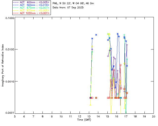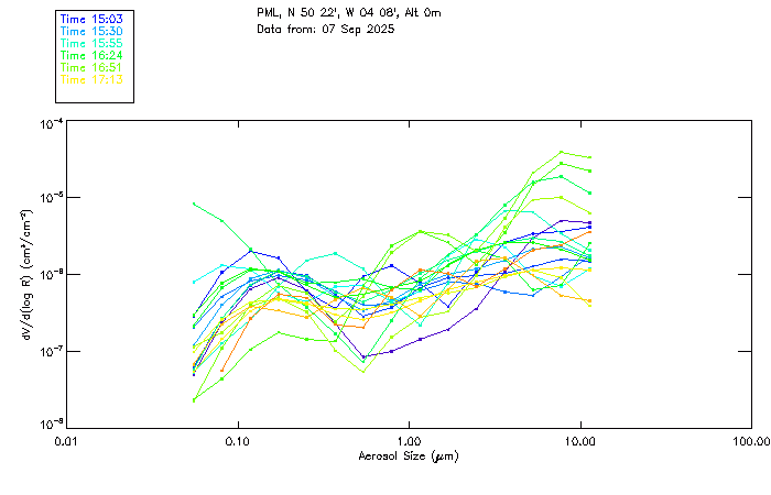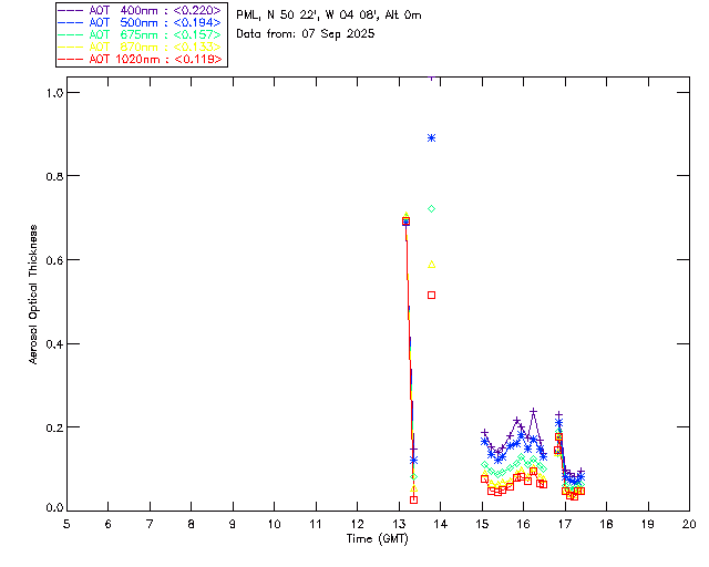 In May 2001 a PREDE POM01-L was installed on the roof of the Plymouth Marine Laboratory to continue the atmospheric correction research of the PML Remote Sensing Group. This was to replace the AERONET CIMEL sunphotometer situated at Rame Head which was decommissioned in 1999. The instrument operates at 7 wavelengths (315, 400, 500, 670, 870, 940 and 1020nm) and scans at pre-set angles away from the solar disk to determine, using the inversion code of Nakajima et al. (2006), various properties of tiny particles called aerosols within the atmospheric column. From these measurements useful atmospheric aerosol parameters such as the Aerosol Optical Thickness (AOT), aerosol size distribution and single scattering albedo can be calculated. Marine aerosols tend to be bigger (D > 1µm) than those generated over the land (0.01 < D < 1µm) and are of a different chemical composition; marine aerosols are salt particles whereas terrestrial aerosols are sulphate compounds.