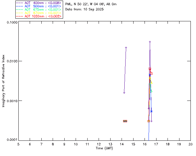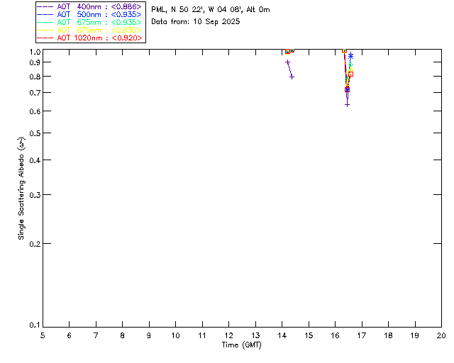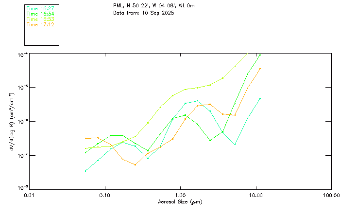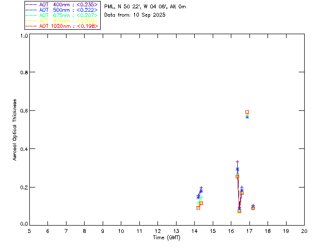 In May 2001 a PREDE POM01-L was installed on the roof of the Plymouth Marine Laboratory to continue the atmospheric correction research of the PML Remote Sensing Group. This was to replace the AERONET CIMEL sunphotometer situated at Rame Head which was decommissioned in 1999. The instrument operates at 7 wavelengths (315, 400, 500, 670, 870, 940 and 1020nm) and scans at pre-set angles away from the solar disk to determine, using the inversion code of Nakajima et al. (2006), various properties of tiny particles called aerosols within the atmospheric column. From these measurements useful atmospheric aerosol parameters such as the Aerosol Optical Thickness (AOT), aerosol size distribution and single scattering albedo can be calculated. Marine aerosols tend to be bigger (D > 1µm) than those generated over the land (0.01 < D < 1µm) and are of a different chemical composition; marine aerosols are salt particles whereas terrestrial aerosols are sulphate compounds.