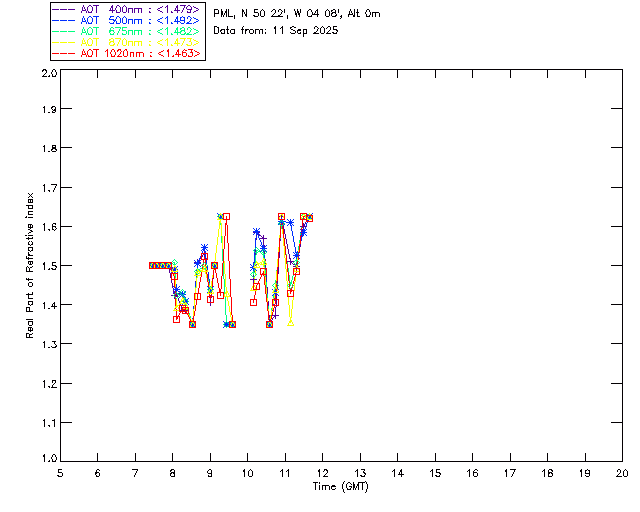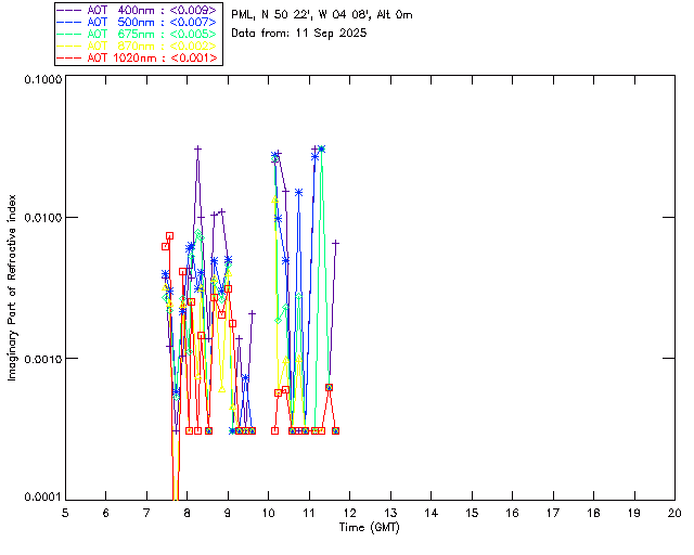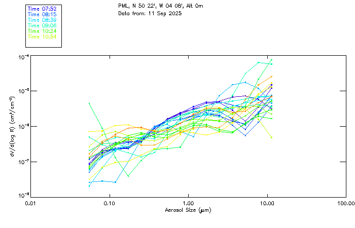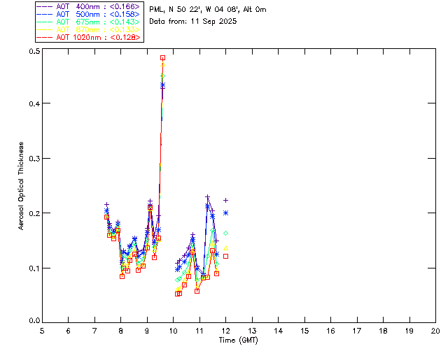 In May 2001 a PREDE POM01-L was installed on the roof of the Plymouth Marine Laboratory to continue the atmospheric correction research of the PML Remote Sensing Group. This was to replace the AERONET CIMEL sunphotometer situated at Rame Head which was decommissioned in 1999. The instrument operates at 7 wavelengths (315, 400, 500, 670, 870, 940 and 1020nm) and scans at pre-set angles away from the solar disk to determine, using the inversion code of Nakajima et al. (2006), various properties of tiny particles called aerosols within the atmospheric column. From these measurements useful atmospheric aerosol parameters such as the Aerosol Optical Thickness (AOT), aerosol size distribution and single scattering albedo can be calculated. Marine aerosols tend to be bigger (D > 1µm) than those generated over the land (0.01 < D < 1µm) and are of a different chemical composition; marine aerosols are salt particles whereas terrestrial aerosols are sulphate compounds.