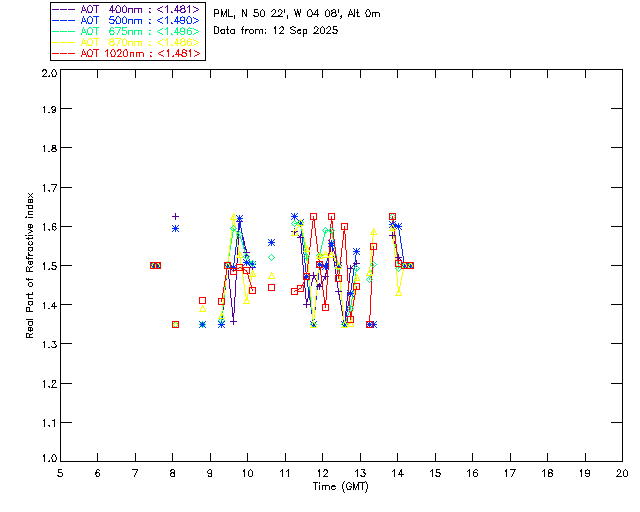 In May 2001 a PREDE POM01-L was installed on the roof of the Plymouth Marine Laboratory to continue the atmospheric correction research of the PML Remote Sensing Group. This was to replace the AERONET CIMEL sunphotometer situated at Rame Head which was decommissioned in 1999. The instrument operates at 7 wavelengths (315, 400, 500, 670, 870, 940 and 1020nm) and scans at pre-set angles away from the solar disk to determine, using the inversion code of Nakajima et al. (2006), various properties of tiny particles called aerosols within the atmospheric column. From these measurements useful atmospheric aerosol parameters such as the Aerosol Optical Thickness (AOT), aerosol size distribution and single scattering albedo can be calculated. Marine aerosols tend to be bigger (D > 1µm) than those generated over the land (0.01 < D < 1µm) and are of a different chemical composition; marine aerosols are salt particles whereas terrestrial aerosols are sulphate compounds.