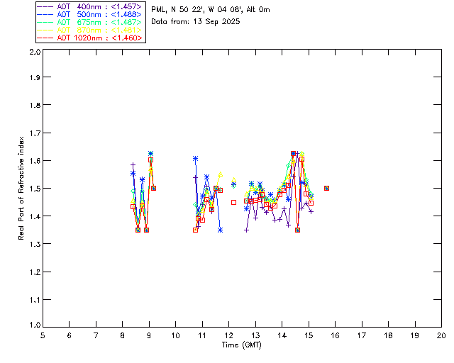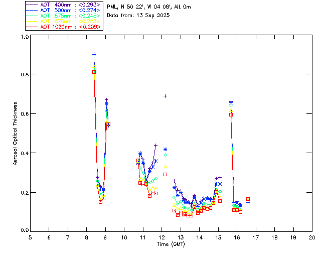 In May 2001 a PREDE POM01-L was installed on the roof of the Plymouth Marine Laboratory to continue the atmospheric correction research of the PML Remote Sensing Group. This was to replace the AERONET CIMEL sunphotometer situated at Rame Head which was decommissioned in 1999. The instrument operates at 7 wavelengths (315, 400, 500, 670, 870, 940 and 1020nm) and scans at pre-set angles away from the solar disk to determine, using the inversion code of Nakajima et al. (2006), various properties of tiny particles called aerosols within the atmospheric column. From these measurements useful atmospheric aerosol parameters such as the Aerosol Optical Thickness (AOT), aerosol size distribution and single scattering albedo can be calculated. Marine aerosols tend to be bigger (D > 1µm) than those generated over the land (0.01 < D < 1µm) and are of a different chemical composition; marine aerosols are salt particles whereas terrestrial aerosols are sulphate compounds.