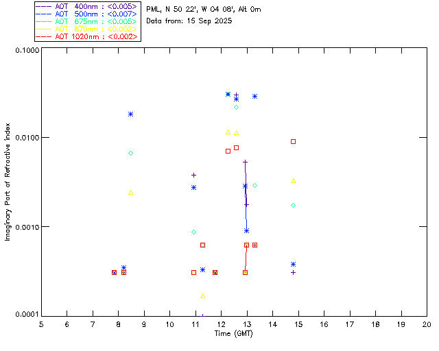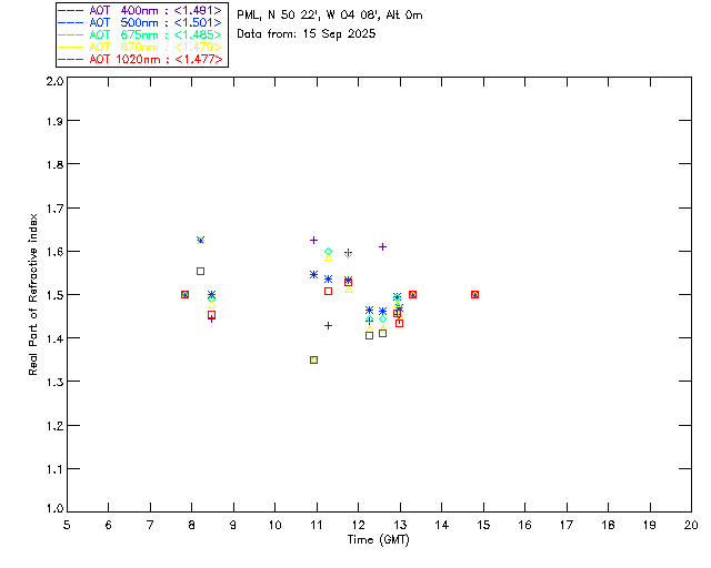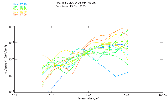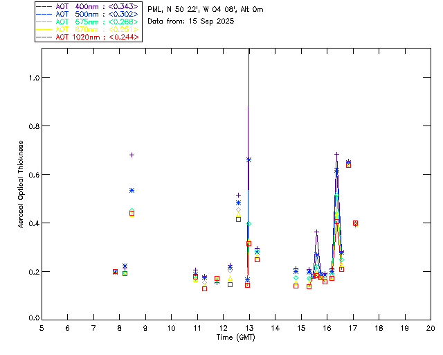 In May 2001 a PREDE POM01-L was installed on the roof of the Plymouth Marine Laboratory to continue the atmospheric correction research of the PML Remote Sensing Group. This was to replace the AERONET CIMEL sunphotometer situated at Rame Head which was decommissioned in 1999. The instrument operates at 7 wavelengths (315, 400, 500, 670, 870, 940 and 1020nm) and scans at pre-set angles away from the solar disk to determine, using the inversion code of Nakajima et al. (2006), various properties of tiny particles called aerosols within the atmospheric column. From these measurements useful atmospheric aerosol parameters such as the Aerosol Optical Thickness (AOT), aerosol size distribution and single scattering albedo can be calculated. Marine aerosols tend to be bigger (D > 1µm) than those generated over the land (0.01 < D < 1µm) and are of a different chemical composition; marine aerosols are salt particles whereas terrestrial aerosols are sulphate compounds.
