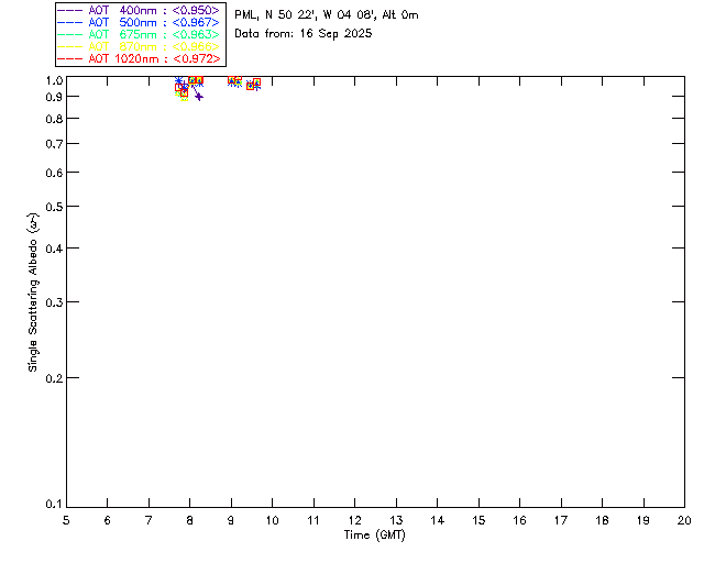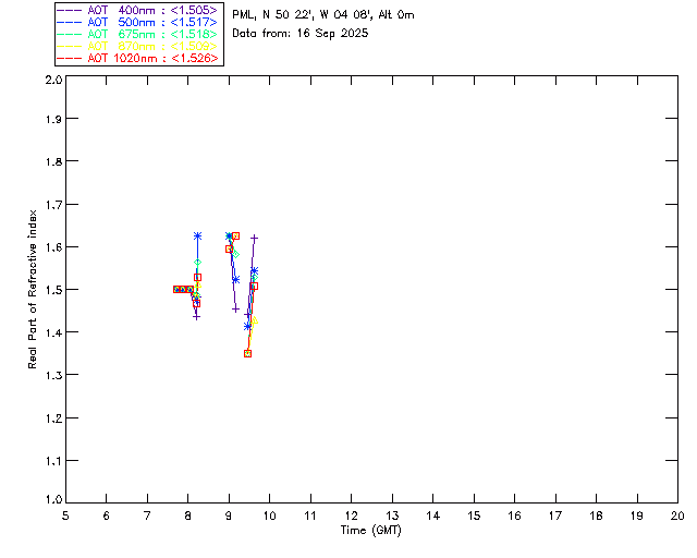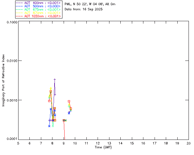 In May 2001 a PREDE POM01-L was installed on the roof of the Plymouth Marine Laboratory to continue the atmospheric correction research of the PML Remote Sensing Group. This was to replace the AERONET CIMEL sunphotometer situated at Rame Head which was decommissioned in 1999. The instrument operates at 7 wavelengths (315, 400, 500, 670, 870, 940 and 1020nm) and scans at pre-set angles away from the solar disk to determine, using the inversion code of Nakajima et al. (2006), various properties of tiny particles called aerosols within the atmospheric column. From these measurements useful atmospheric aerosol parameters such as the Aerosol Optical Thickness (AOT), aerosol size distribution and single scattering albedo can be calculated. Marine aerosols tend to be bigger (D > 1µm) than those generated over the land (0.01 < D < 1µm) and are of a different chemical composition; marine aerosols are salt particles whereas terrestrial aerosols are sulphate compounds.