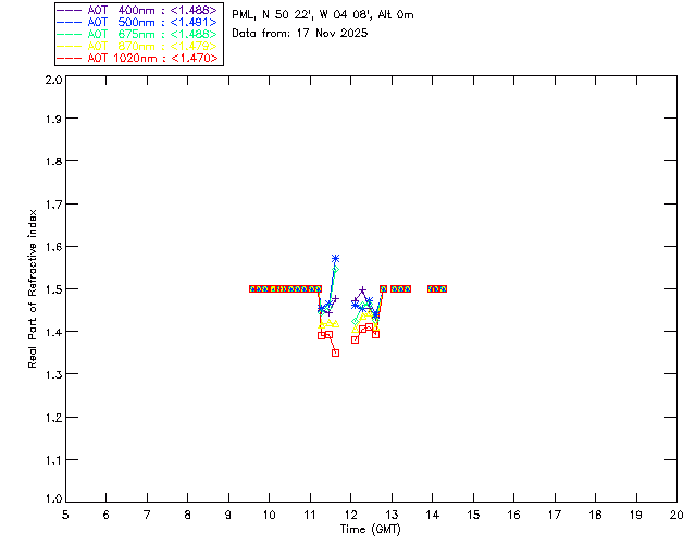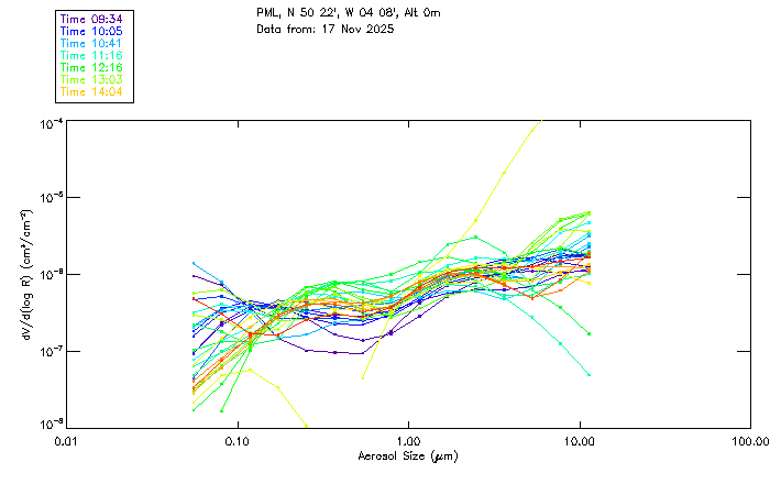 In May 2001 a PREDE POM01-L was installed on the roof of the Plymouth Marine Laboratory to continue the atmospheric correction research of the PML Remote Sensing Group. This was to replace the AERONET CIMEL sunphotometer situated at Rame Head which was decommissioned in 1999. The instrument operates at 7 wavelengths (315, 400, 500, 670, 870, 940 and 1020nm) and scans at pre-set angles away from the solar disk to determine, using the inversion code of Nakajima et al. (2006), various properties of tiny particles called aerosols within the atmospheric column. From these measurements useful atmospheric aerosol parameters such as the Aerosol Optical Thickness (AOT), aerosol size distribution and single scattering albedo can be calculated. Marine aerosols tend to be bigger (D > 1µm) than those generated over the land (0.01 < D < 1µm) and are of a different chemical composition; marine aerosols are salt particles whereas terrestrial aerosols are sulphate compounds.