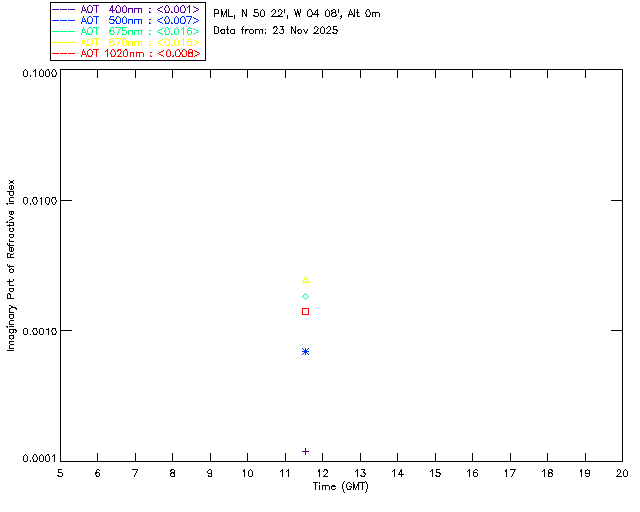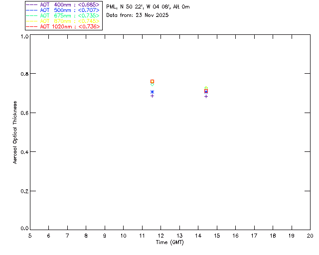 In May 2001 a PREDE POM01-L was installed on the roof of the Plymouth Marine Laboratory to continue the atmospheric correction research of the PML Remote Sensing Group. This was to replace the AERONET CIMEL sunphotometer situated at Rame Head which was decommissioned in 1999. The instrument operates at 7 wavelengths (315, 400, 500, 670, 870, 940 and 1020nm) and scans at pre-set angles away from the solar disk to determine, using the inversion code of Nakajima et al. (2006), various properties of tiny particles called aerosols within the atmospheric column. From these measurements useful atmospheric aerosol parameters such as the Aerosol Optical Thickness (AOT), aerosol size distribution and single scattering albedo can be calculated. Marine aerosols tend to be bigger (D > 1µm) than those generated over the land (0.01 < D < 1µm) and are of a different chemical composition; marine aerosols are salt particles whereas terrestrial aerosols are sulphate compounds.