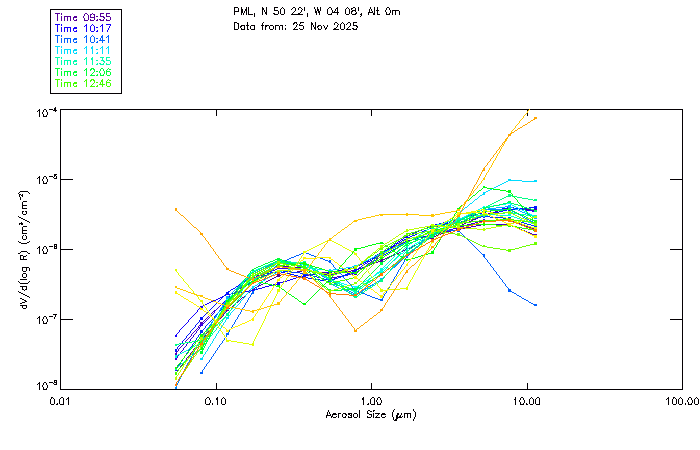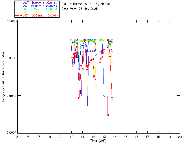 In May 2001 a PREDE POM01-L was installed on the roof of the Plymouth Marine Laboratory to continue the atmospheric correction research of the PML Remote Sensing Group. This was to replace the AERONET CIMEL sunphotometer situated at Rame Head which was decommissioned in 1999. The instrument operates at 7 wavelengths (315, 400, 500, 670, 870, 940 and 1020nm) and scans at pre-set angles away from the solar disk to determine, using the inversion code of Nakajima et al. (2006), various properties of tiny particles called aerosols within the atmospheric column. From these measurements useful atmospheric aerosol parameters such as the Aerosol Optical Thickness (AOT), aerosol size distribution and single scattering albedo can be calculated. Marine aerosols tend to be bigger (D > 1µm) than those generated over the land (0.01 < D < 1µm) and are of a different chemical composition; marine aerosols are salt particles whereas terrestrial aerosols are sulphate compounds.
