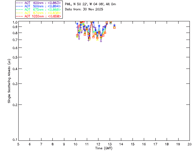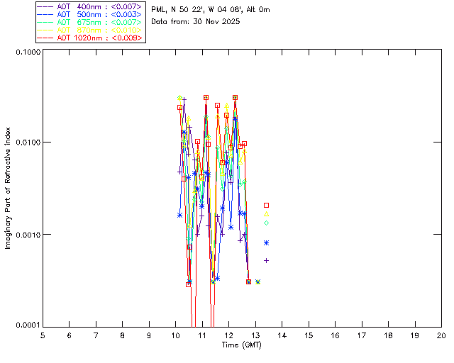In May 2001 a PREDE POM01-L was installed on the roof of the Plymouth Marine Laboratory to continue the atmospheric correction research of the PML Remote Sensing Group. This was to replace the AERONET CIMEL sunphotometer situated at Rame Head which was decommissioned in 1999. The instrument operates at 7 wavelengths (315, 400, 500, 670, 870, 940 and 1020nm) and scans at pre-set angles away from the solar disk to determine, using the inversion code of Nakajima et al. (2006), various properties of tiny particles called aerosols within the atmospheric column. From these measurements useful atmospheric aerosol parameters such as the Aerosol Optical Thickness (AOT), aerosol size distribution and single scattering albedo can be calculated. Marine aerosols tend to be bigger (D > 1µm) than those generated over the land (0.01 < D < 1µm) and are of a different chemical composition; marine aerosols are salt particles whereas terrestrial aerosols are sulphate compounds.