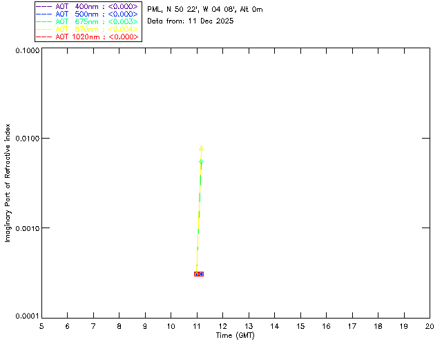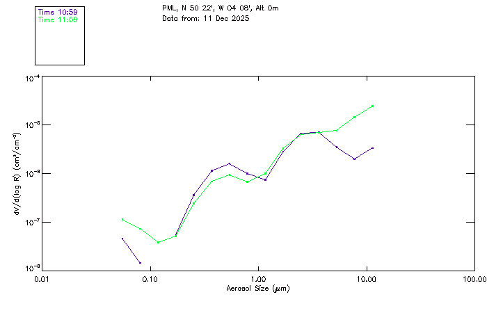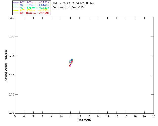 In May 2001 a PREDE POM01-L was installed on the roof of the Plymouth Marine Laboratory to continue the atmospheric correction research of the PML Remote Sensing Group. This was to replace the AERONET CIMEL sunphotometer situated at Rame Head which was decommissioned in 1999. The instrument operates at 7 wavelengths (315, 400, 500, 670, 870, 940 and 1020nm) and scans at pre-set angles away from the solar disk to determine, using the inversion code of Nakajima et al. (2006), various properties of tiny particles called aerosols within the atmospheric column. From these measurements useful atmospheric aerosol parameters such as the Aerosol Optical Thickness (AOT), aerosol size distribution and single scattering albedo can be calculated. Marine aerosols tend to be bigger (D > 1µm) than those generated over the land (0.01 < D < 1µm) and are of a different chemical composition; marine aerosols are salt particles whereas terrestrial aerosols are sulphate compounds.
