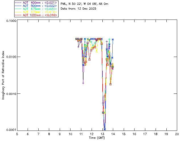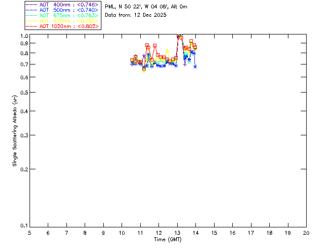 In May 2001 a PREDE POM01-L was installed on the roof of the Plymouth Marine Laboratory to continue the atmospheric correction research of the PML Remote Sensing Group. This was to replace the AERONET CIMEL sunphotometer situated at Rame Head which was decommissioned in 1999. The instrument operates at 7 wavelengths (315, 400, 500, 670, 870, 940 and 1020nm) and scans at pre-set angles away from the solar disk to determine, using the inversion code of Nakajima et al. (2006), various properties of tiny particles called aerosols within the atmospheric column. From these measurements useful atmospheric aerosol parameters such as the Aerosol Optical Thickness (AOT), aerosol size distribution and single scattering albedo can be calculated. Marine aerosols tend to be bigger (D > 1µm) than those generated over the land (0.01 < D < 1µm) and are of a different chemical composition; marine aerosols are salt particles whereas terrestrial aerosols are sulphate compounds.