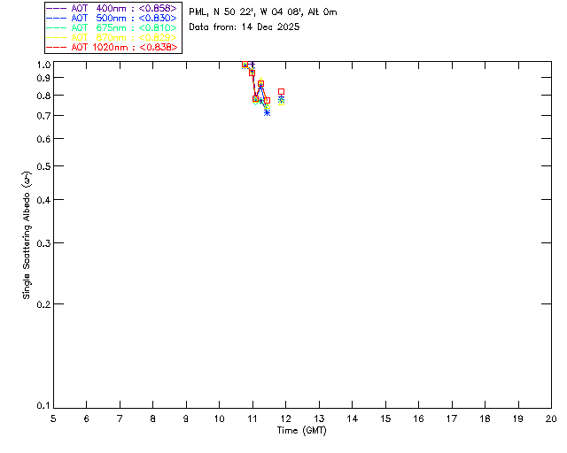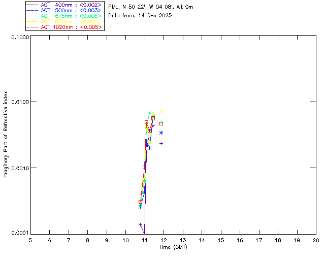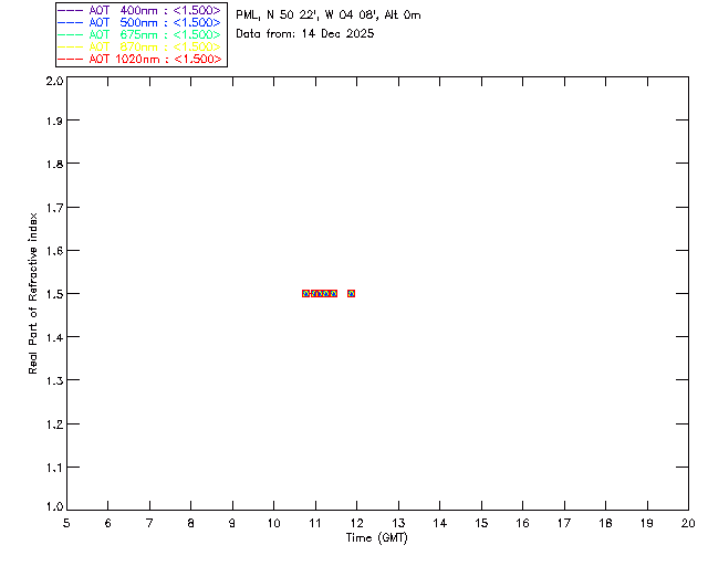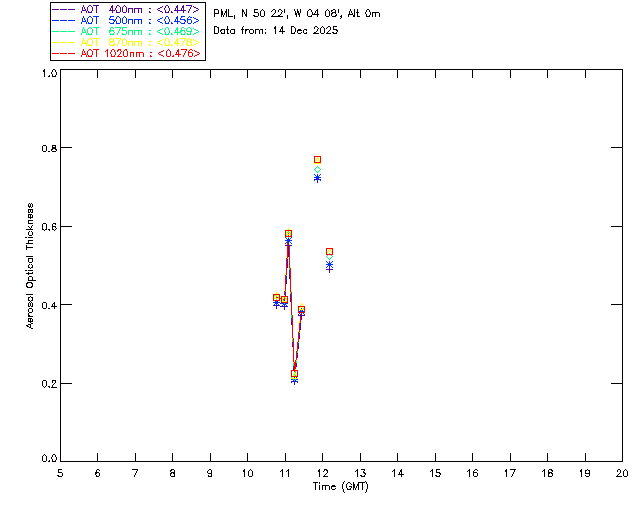 In May 2001 a PREDE POM01-L was installed on the roof of the Plymouth Marine Laboratory to continue the atmospheric correction research of the PML Remote Sensing Group. This was to replace the AERONET CIMEL sunphotometer situated at Rame Head which was decommissioned in 1999. The instrument operates at 7 wavelengths (315, 400, 500, 670, 870, 940 and 1020nm) and scans at pre-set angles away from the solar disk to determine, using the inversion code of Nakajima et al. (2006), various properties of tiny particles called aerosols within the atmospheric column. From these measurements useful atmospheric aerosol parameters such as the Aerosol Optical Thickness (AOT), aerosol size distribution and single scattering albedo can be calculated. Marine aerosols tend to be bigger (D > 1µm) than those generated over the land (0.01 < D < 1µm) and are of a different chemical composition; marine aerosols are salt particles whereas terrestrial aerosols are sulphate compounds.