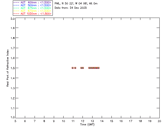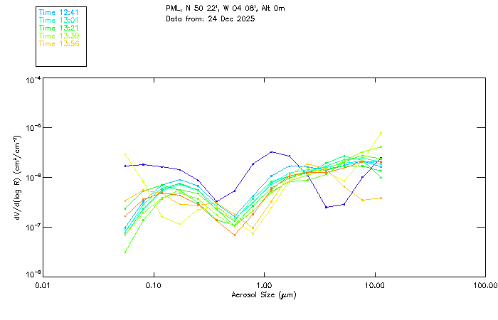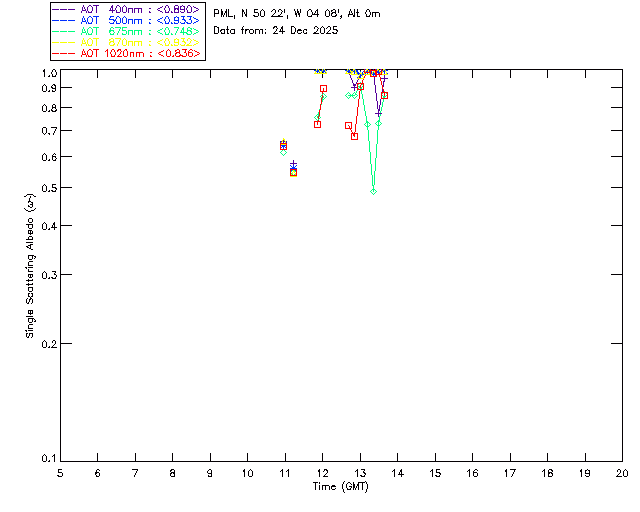 In May 2001 a PREDE POM01-L was installed on the roof of the Plymouth Marine Laboratory to continue the atmospheric correction research of the PML Remote Sensing Group. This was to replace the AERONET CIMEL sunphotometer situated at Rame Head which was decommissioned in 1999. The instrument operates at 7 wavelengths (315, 400, 500, 670, 870, 940 and 1020nm) and scans at pre-set angles away from the solar disk to determine, using the inversion code of Nakajima et al. (2006), various properties of tiny particles called aerosols within the atmospheric column. From these measurements useful atmospheric aerosol parameters such as the Aerosol Optical Thickness (AOT), aerosol size distribution and single scattering albedo can be calculated. Marine aerosols tend to be bigger (D > 1µm) than those generated over the land (0.01 < D < 1µm) and are of a different chemical composition; marine aerosols are salt particles whereas terrestrial aerosols are sulphate compounds.