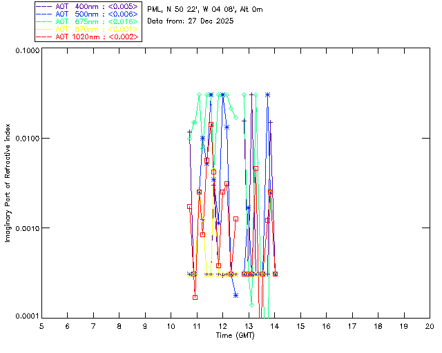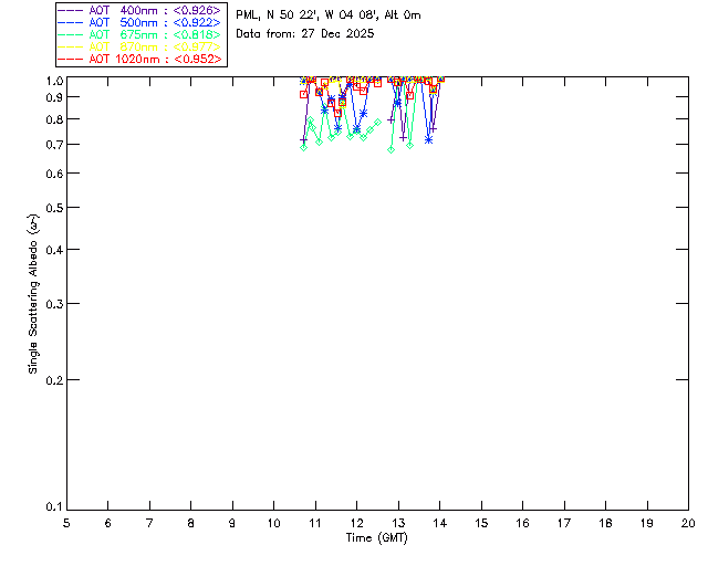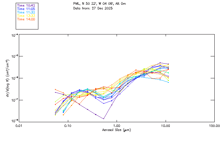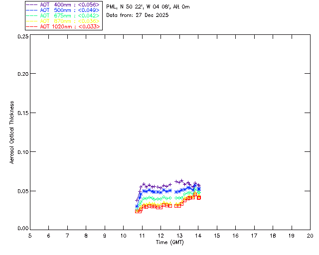 In May 2001 a PREDE POM01-L was installed on the roof of the Plymouth Marine Laboratory to continue the atmospheric correction research of the PML Remote Sensing Group. This was to replace the AERONET CIMEL sunphotometer situated at Rame Head which was decommissioned in 1999. The instrument operates at 7 wavelengths (315, 400, 500, 670, 870, 940 and 1020nm) and scans at pre-set angles away from the solar disk to determine, using the inversion code of Nakajima et al. (2006), various properties of tiny particles called aerosols within the atmospheric column. From these measurements useful atmospheric aerosol parameters such as the Aerosol Optical Thickness (AOT), aerosol size distribution and single scattering albedo can be calculated. Marine aerosols tend to be bigger (D > 1µm) than those generated over the land (0.01 < D < 1µm) and are of a different chemical composition; marine aerosols are salt particles whereas terrestrial aerosols are sulphate compounds.