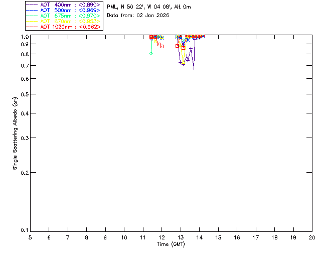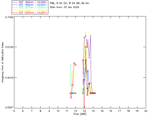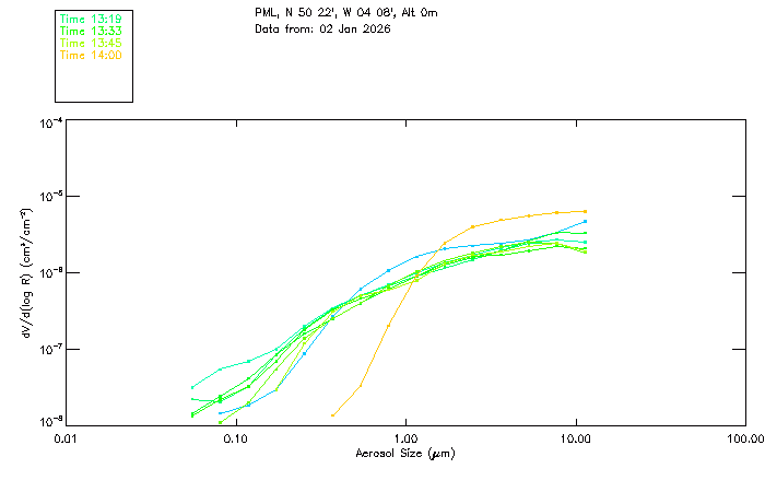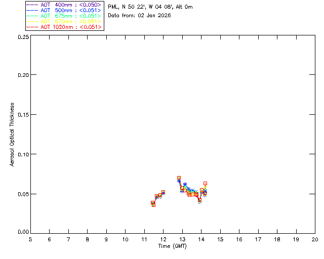 In May 2001 a PREDE POM01-L was installed on the roof of the Plymouth Marine Laboratory to continue the atmospheric correction research of the PML Remote Sensing Group. This was to replace the AERONET CIMEL sunphotometer situated at Rame Head which was decommissioned in 1999. The instrument operates at 7 wavelengths (315, 400, 500, 670, 870, 940 and 1020nm) and scans at pre-set angles away from the solar disk to determine, using the inversion code of Nakajima et al. (2006), various properties of tiny particles called aerosols within the atmospheric column. From these measurements useful atmospheric aerosol parameters such as the Aerosol Optical Thickness (AOT), aerosol size distribution and single scattering albedo can be calculated. Marine aerosols tend to be bigger (D > 1µm) than those generated over the land (0.01 < D < 1µm) and are of a different chemical composition; marine aerosols are salt particles whereas terrestrial aerosols are sulphate compounds.