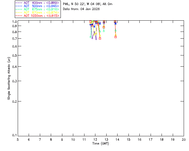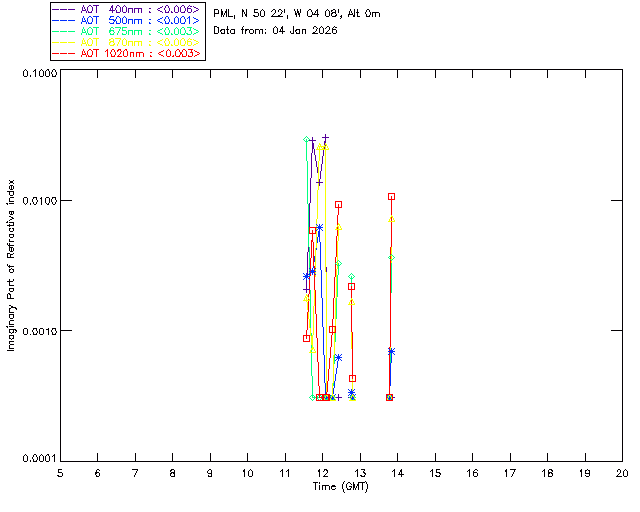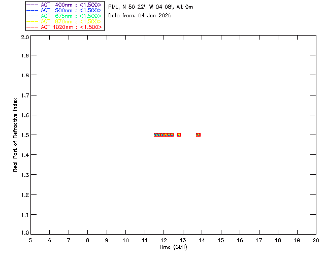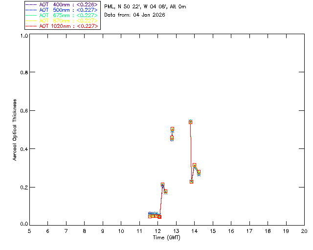 In May 2001 a PREDE POM01-L was installed on the roof of the Plymouth Marine Laboratory to continue the atmospheric correction research of the PML Remote Sensing Group. This was to replace the AERONET CIMEL sunphotometer situated at Rame Head which was decommissioned in 1999. The instrument operates at 7 wavelengths (315, 400, 500, 670, 870, 940 and 1020nm) and scans at pre-set angles away from the solar disk to determine, using the inversion code of Nakajima et al. (2006), various properties of tiny particles called aerosols within the atmospheric column. From these measurements useful atmospheric aerosol parameters such as the Aerosol Optical Thickness (AOT), aerosol size distribution and single scattering albedo can be calculated. Marine aerosols tend to be bigger (D > 1µm) than those generated over the land (0.01 < D < 1µm) and are of a different chemical composition; marine aerosols are salt particles whereas terrestrial aerosols are sulphate compounds.