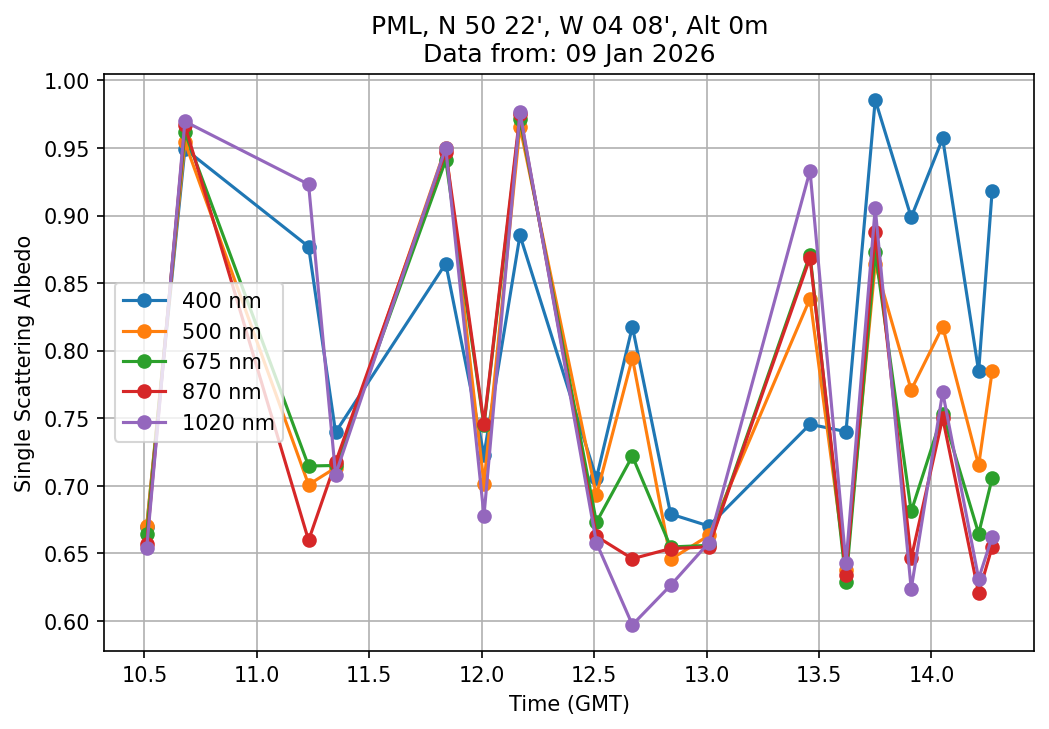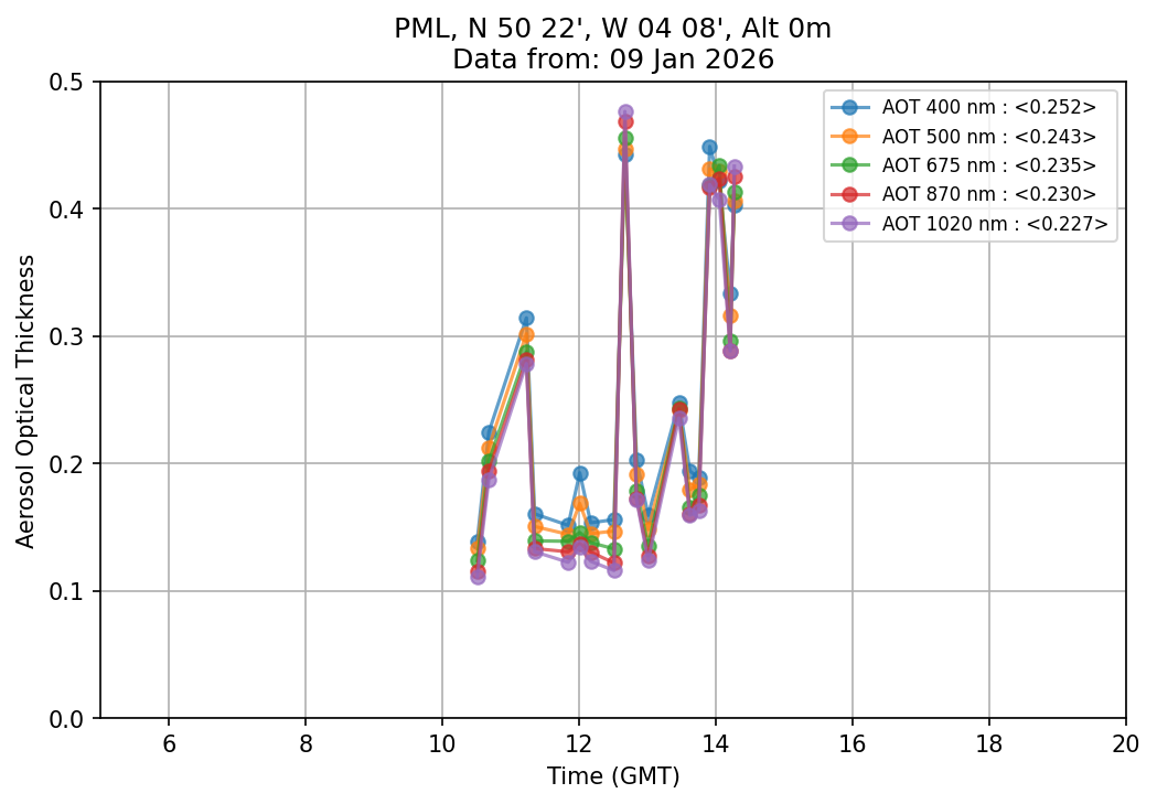 In May 2001 a PREDE POM01-L was installed on the roof of the Plymouth Marine Laboratory to continue the atmospheric correction research of the PML Remote Sensing Group. This was to replace the AERONET CIMEL sunphotometer situated at Rame Head which was decommissioned in 1999. The instrument operates at 7 wavelengths (315, 400, 500, 670, 870, 940 and 1020nm) and scans at pre-set angles away from the solar disk to determine, using the inversion code of Nakajima et al. (2006), various properties of tiny particles called aerosols within the atmospheric column. From these measurements useful atmospheric aerosol parameters such as the Aerosol Optical Thickness (AOT), aerosol size distribution and single scattering albedo can be calculated. Marine aerosols tend to be bigger (D > 1µm) than those generated over the land (0.01 < D < 1µm) and are of a different chemical composition; marine aerosols are salt particles whereas terrestrial aerosols are sulphate compounds.