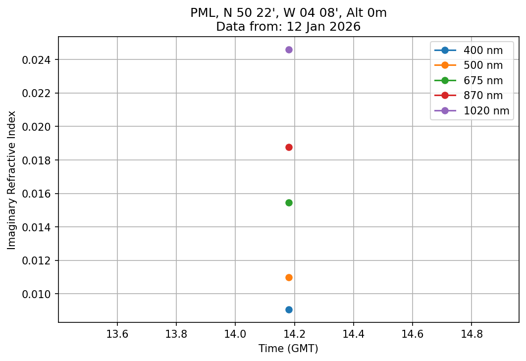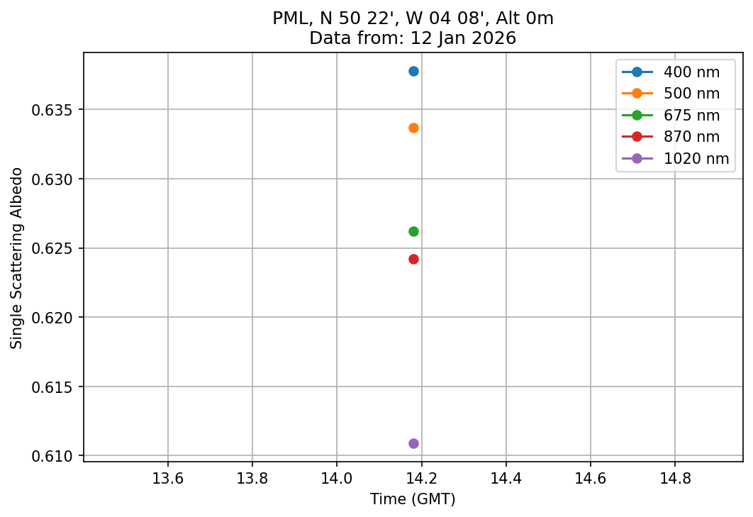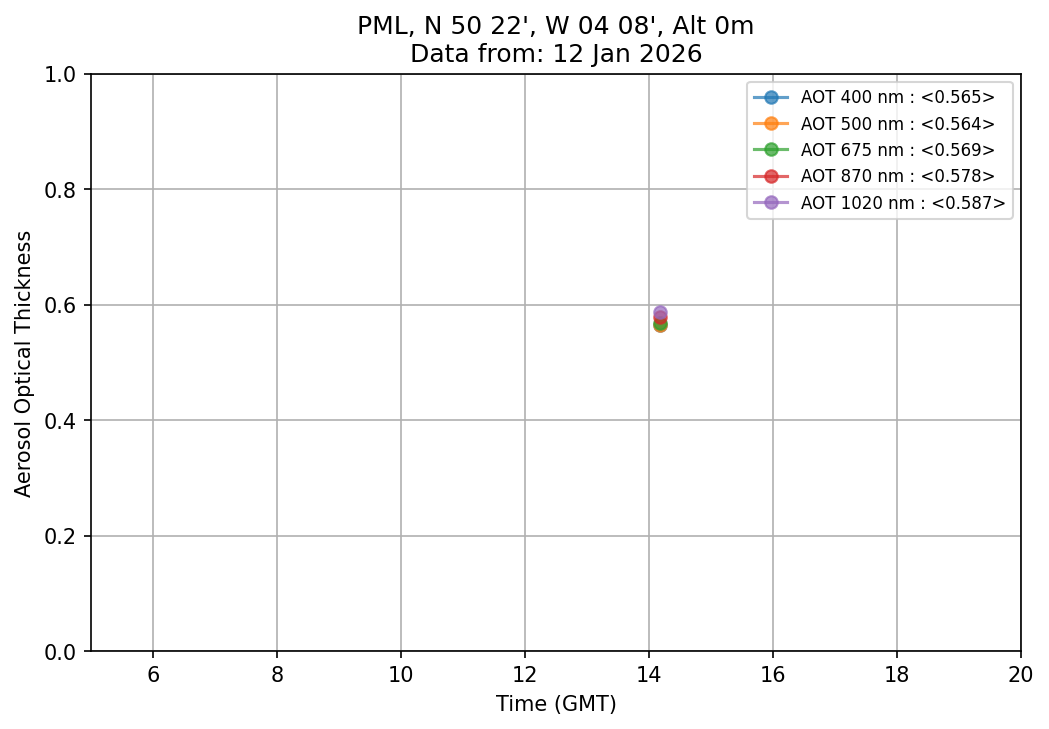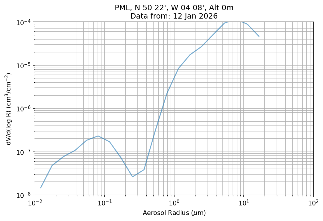 In May 2001 a PREDE POM01-L was installed on the roof of the Plymouth Marine Laboratory to continue the atmospheric correction research of the PML Remote Sensing Group. This was to replace the AERONET CIMEL sunphotometer situated at Rame Head which was decommissioned in 1999. The instrument operates at 7 wavelengths (315, 400, 500, 670, 870, 940 and 1020nm) and scans at pre-set angles away from the solar disk to determine, using the inversion code of Nakajima et al. (2006), various properties of tiny particles called aerosols within the atmospheric column. From these measurements useful atmospheric aerosol parameters such as the Aerosol Optical Thickness (AOT), aerosol size distribution and single scattering albedo can be calculated. Marine aerosols tend to be bigger (D > 1µm) than those generated over the land (0.01 < D < 1µm) and are of a different chemical composition; marine aerosols are salt particles whereas terrestrial aerosols are sulphate compounds.