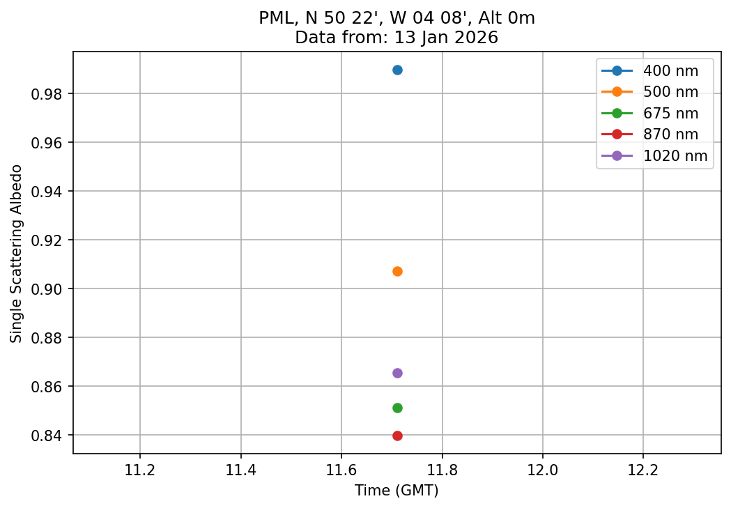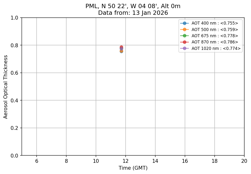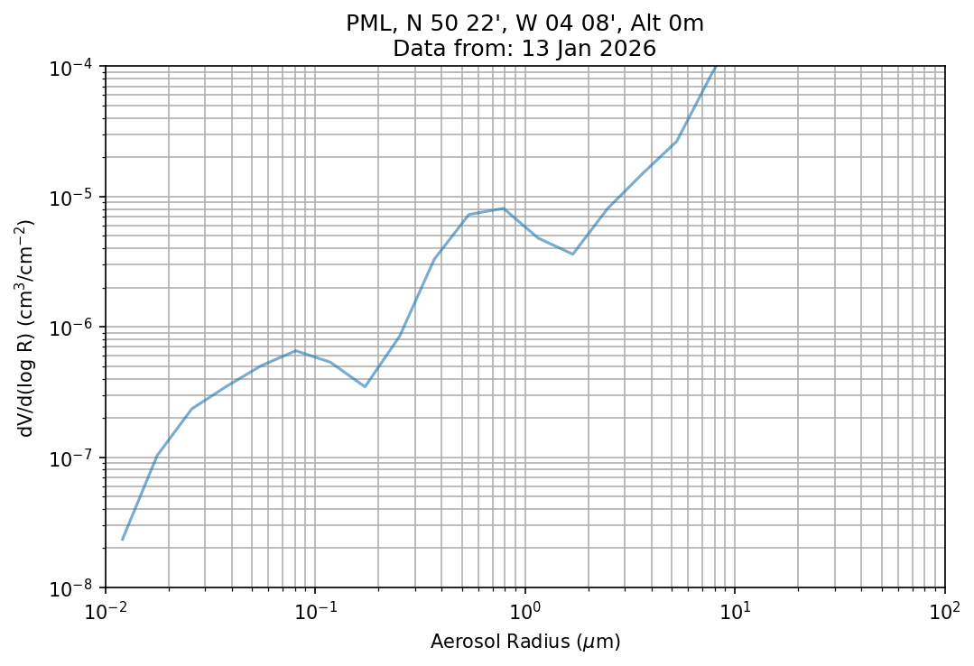 In May 2001 a PREDE POM01-L was installed on the roof of the Plymouth Marine Laboratory to continue the atmospheric correction research of the PML Remote Sensing Group. This was to replace the AERONET CIMEL sunphotometer situated at Rame Head which was decommissioned in 1999. The instrument operates at 7 wavelengths (315, 400, 500, 670, 870, 940 and 1020nm) and scans at pre-set angles away from the solar disk to determine, using the inversion code of Nakajima et al. (2006), various properties of tiny particles called aerosols within the atmospheric column. From these measurements useful atmospheric aerosol parameters such as the Aerosol Optical Thickness (AOT), aerosol size distribution and single scattering albedo can be calculated. Marine aerosols tend to be bigger (D > 1µm) than those generated over the land (0.01 < D < 1µm) and are of a different chemical composition; marine aerosols are salt particles whereas terrestrial aerosols are sulphate compounds.