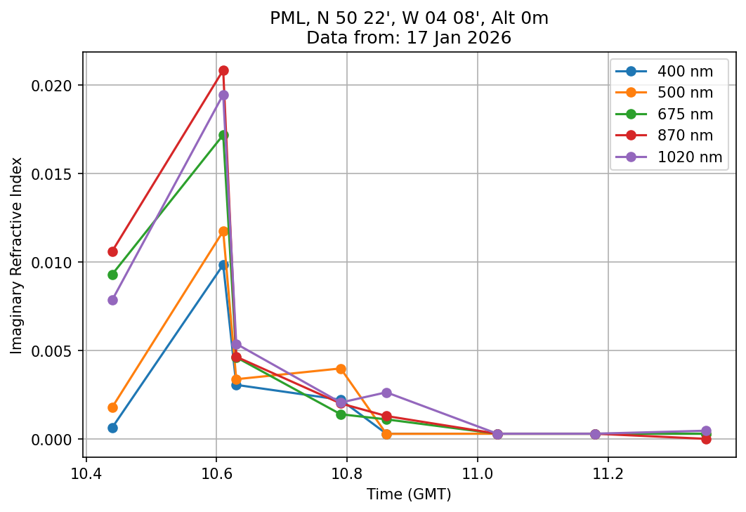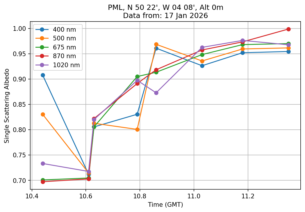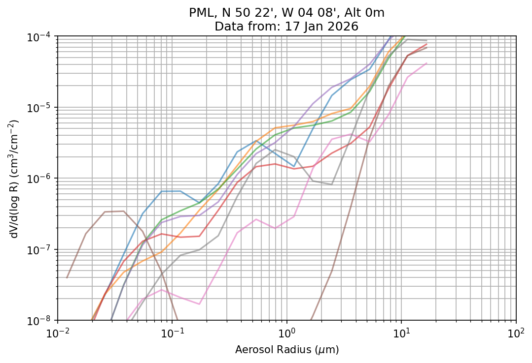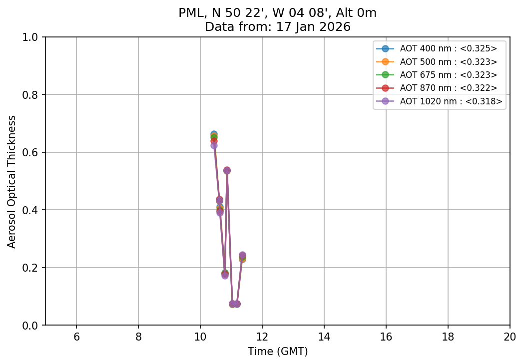 In May 2001 a PREDE POM01-L was installed on the roof of the Plymouth Marine Laboratory to continue the atmospheric correction research of the PML Remote Sensing Group. This was to replace the AERONET CIMEL sunphotometer situated at Rame Head which was decommissioned in 1999. The instrument operates at 7 wavelengths (315, 400, 500, 670, 870, 940 and 1020nm) and scans at pre-set angles away from the solar disk to determine, using the inversion code of Nakajima et al. (2006), various properties of tiny particles called aerosols within the atmospheric column. From these measurements useful atmospheric aerosol parameters such as the Aerosol Optical Thickness (AOT), aerosol size distribution and single scattering albedo can be calculated. Marine aerosols tend to be bigger (D > 1µm) than those generated over the land (0.01 < D < 1µm) and are of a different chemical composition; marine aerosols are salt particles whereas terrestrial aerosols are sulphate compounds.