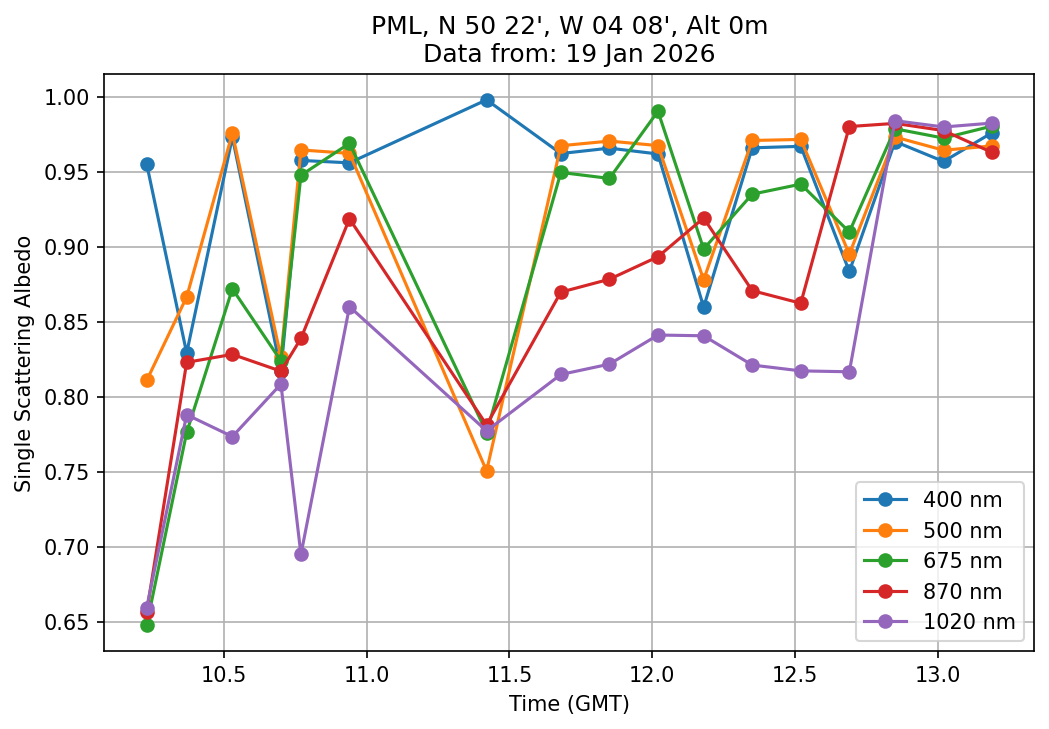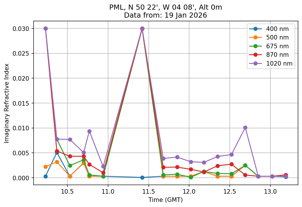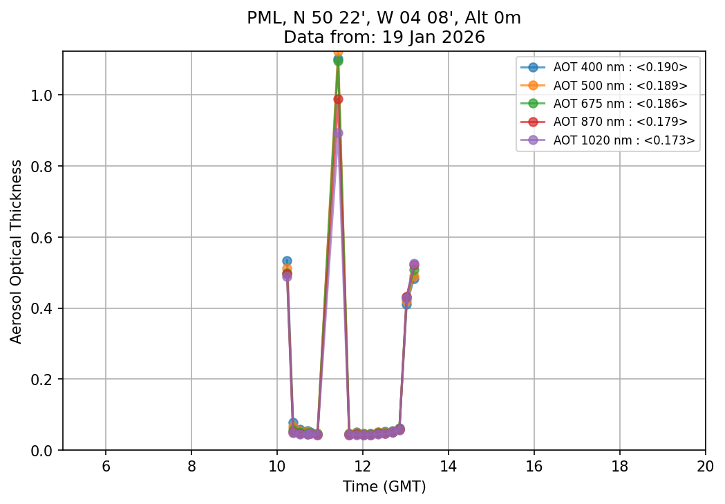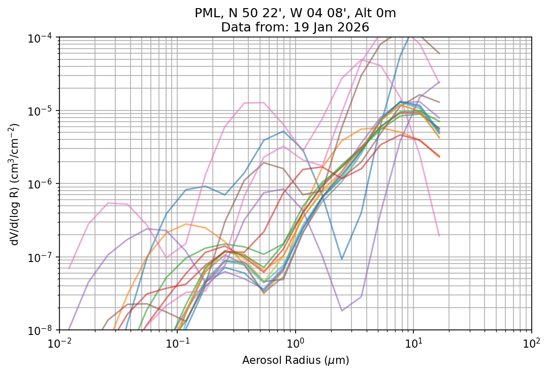 In May 2001 a PREDE POM01-L was installed on the roof of the Plymouth Marine Laboratory to continue the atmospheric correction research of the PML Remote Sensing Group. This was to replace the AERONET CIMEL sunphotometer situated at Rame Head which was decommissioned in 1999. The instrument operates at 7 wavelengths (315, 400, 500, 670, 870, 940 and 1020nm) and scans at pre-set angles away from the solar disk to determine, using the inversion code of Nakajima et al. (2006), various properties of tiny particles called aerosols within the atmospheric column. From these measurements useful atmospheric aerosol parameters such as the Aerosol Optical Thickness (AOT), aerosol size distribution and single scattering albedo can be calculated. Marine aerosols tend to be bigger (D > 1µm) than those generated over the land (0.01 < D < 1µm) and are of a different chemical composition; marine aerosols are salt particles whereas terrestrial aerosols are sulphate compounds.