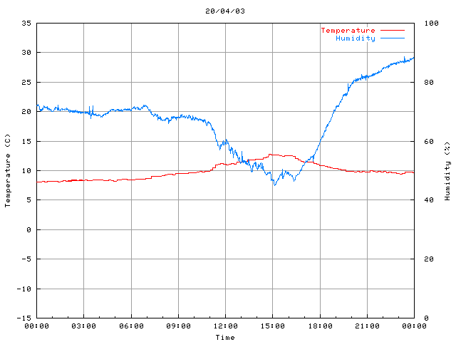 The PML meteorological station, situated on the south-west corner of the building roof, consists of a Hygroclip S3 temperature and humidity sensor housed in a radiation shield, a Mierij Meteo solid state wind sensor (MMW-005), a Chelsea instruments half-hemisphere PAR sensor, a Li-Cor pyranometer (LI-200SZ) and an Omni Instruments 6" tipping bucket raingauge (RG200). The data are logged every 5 minutes using a Pace Scientific XR5 data logger. The real-time rainfall data is likely in error - the correct values will be displayed after a time lag of approximately 24 hours. The meteorological station is sheltered from winds in the north-east and underestimates winds from this quarter. To use these data please contact Dr Tim Smyth.