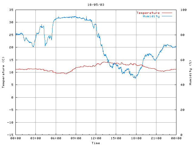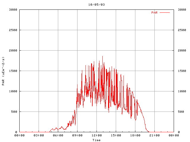 The PML meteorological station, situated on the south-west corner of the building roof, consists of a Hygroclip S3 temperature and humidity sensor housed in a radiation shield, a Mierij Meteo solid state wind sensor (MMW-005), a Chelsea instruments half-hemisphere PAR sensor, a Li-Cor pyranometer (LI-200SZ) and an Omni Instruments 6" tipping bucket raingauge (RG200). The data are logged every 5 minutes using a Pace Scientific XR5 data logger. The real-time rainfall data is likely in error - the correct values will be displayed after a time lag of approximately 24 hours. The meteorological station is sheltered from winds in the north-east and underestimates winds from this quarter. To use these data please contact Dr Tim Smyth.