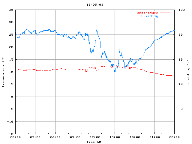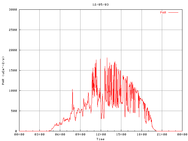 The PML meteorological station, situated on the south-west corner of the building roof, consists of a Hygroclip S3 temperature and humidity sensor housed in a radiation shield, a Mierij Meteo solid state wind sensor (MMW-005), a Chelsea instruments half-hemisphere PAR sensor, a Li-Cor pyranometer (LI-200SZ) and an Omni Instruments 6" tipping bucket raingauge (RG200). The data are logged every 5 minutes using a Pace Scientific XR5 data logger. The real-time rainfall data is likely in error - the correct values will be displayed after a time lag of approximately 24 hours. The meteorological station is sheltered from winds in the north-east and underestimates winds from this quarter. To use these data please contact Dr Tim Smyth.