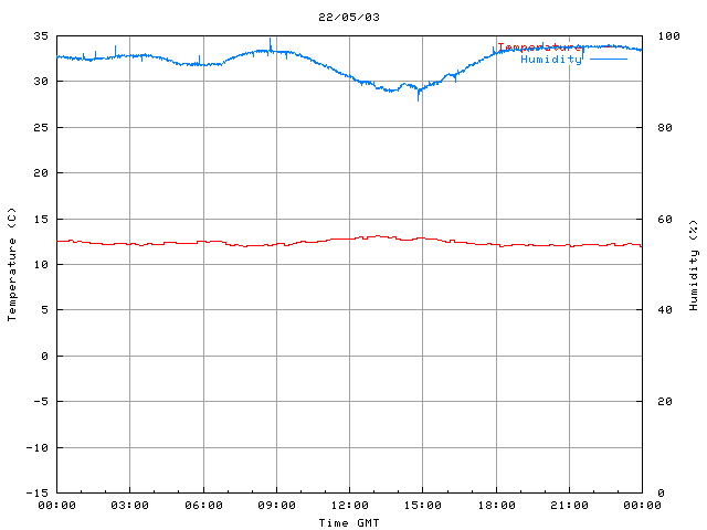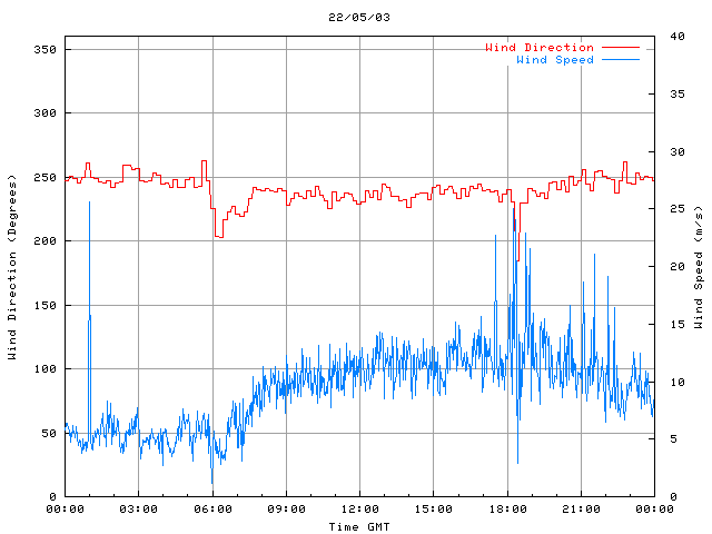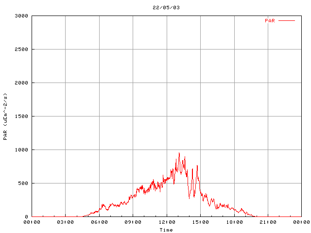 The PML meteorological station, situated on the south-west corner of the building roof, consists of a Hygroclip S3 temperature and humidity sensor housed in a radiation shield, a Mierij Meteo solid state wind sensor (MMW-005), a Chelsea instruments half-hemisphere PAR sensor, a Li-Cor pyranometer (LI-200SZ) and an Omni Instruments 6" tipping bucket raingauge (RG200). The data are logged every 5 minutes using a Pace Scientific XR5 data logger. The real-time rainfall data is likely in error - the correct values will be displayed after a time lag of approximately 24 hours. The meteorological station is sheltered from winds in the north-east and underestimates winds from this quarter. To use these data please contact Dr Tim Smyth.