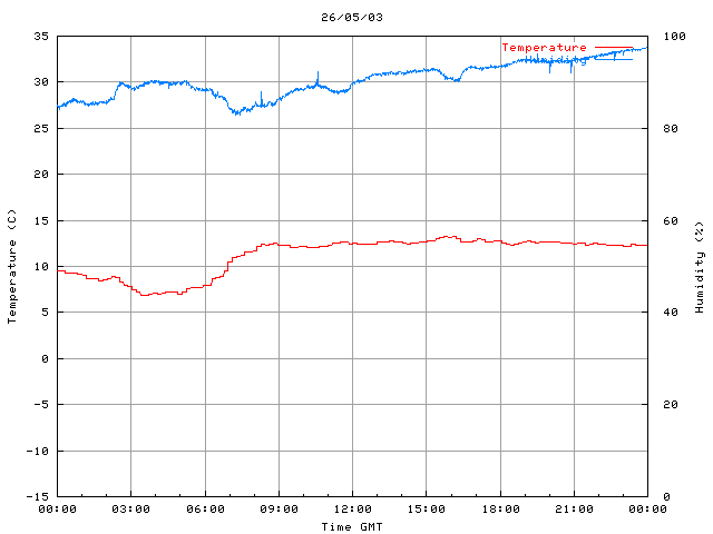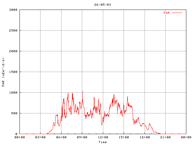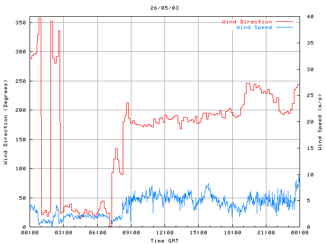 The PML meteorological station, situated on the south-west corner of the building roof, consists of a Hygroclip S3 temperature and humidity sensor housed in a radiation shield, a Mierij Meteo solid state wind sensor (MMW-005), a Chelsea instruments half-hemisphere PAR sensor, a Li-Cor pyranometer (LI-200SZ) and an Omni Instruments 6" tipping bucket raingauge (RG200). The data are logged every 5 minutes using a Pace Scientific XR5 data logger. The real-time rainfall data is likely in error - the correct values will be displayed after a time lag of approximately 24 hours. The meteorological station is sheltered from winds in the north-east and underestimates winds from this quarter. To use these data please contact Dr Tim Smyth.
