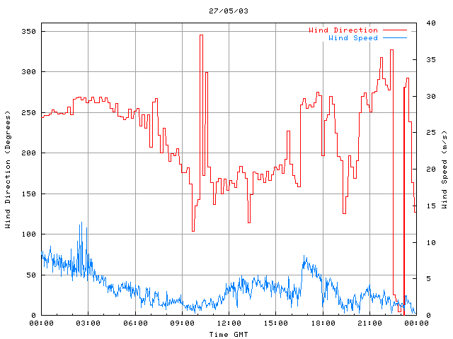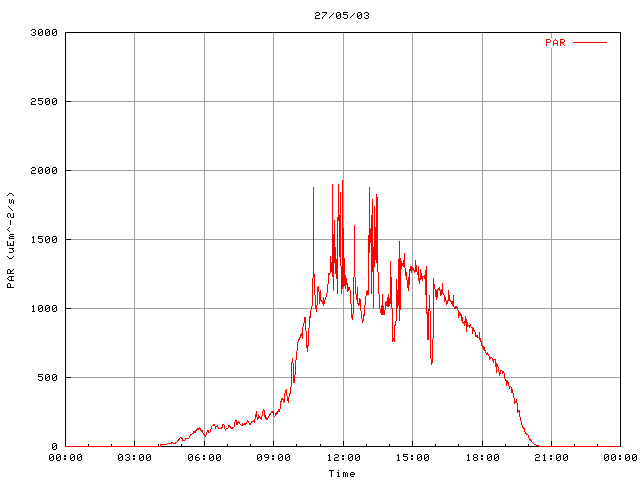 The PML meteorological station, situated on the south-west corner of the building roof, consists of a Hygroclip S3 temperature and humidity sensor housed in a radiation shield, a Mierij Meteo solid state wind sensor (MMW-005), a Chelsea instruments half-hemisphere PAR sensor, a Li-Cor pyranometer (LI-200SZ) and an Omni Instruments 6" tipping bucket raingauge (RG200). The data are logged every 5 minutes using a Pace Scientific XR5 data logger. The real-time rainfall data is likely in error - the correct values will be displayed after a time lag of approximately 24 hours. The meteorological station is sheltered from winds in the north-east and underestimates winds from this quarter. To use these data please contact Dr Tim Smyth.