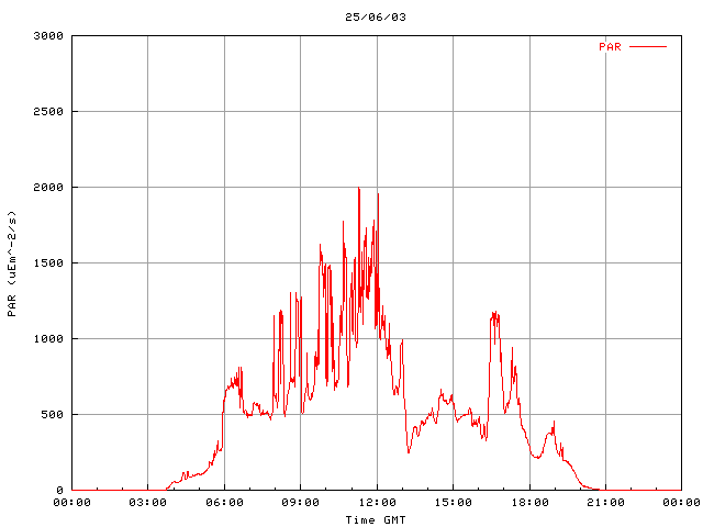 The PML meteorological station, situated on the south-west corner of the building roof, consists of a Hygroclip S3 temperature and humidity sensor housed in a radiation shield, a Mierij Meteo solid state wind sensor (MMW-005), a Chelsea instruments half-hemisphere PAR sensor, a Li-Cor pyranometer (LI-200SZ) and an Omni Instruments 6" tipping bucket raingauge (RG200). The data are logged every 5 minutes using a Pace Scientific XR5 data logger. The real-time rainfall data is likely in error - the correct values will be displayed after a time lag of approximately 24 hours. The meteorological station is sheltered from winds in the north-east and underestimates winds from this quarter. To use these data please contact Dr Tim Smyth.